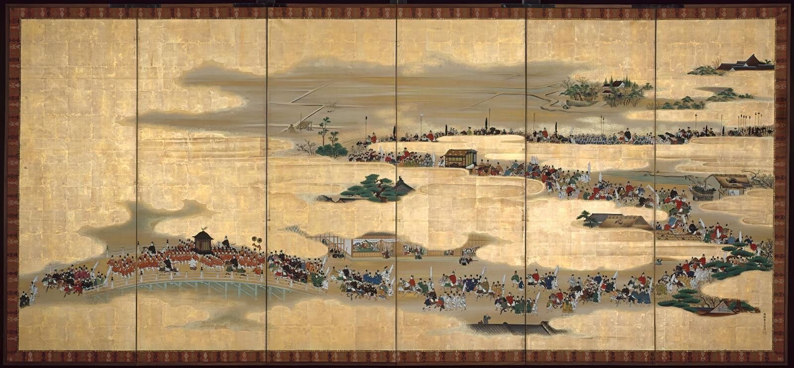 《寛政期 新御所への行列図屏風》 右隻。右上:聖護院,左下に三條大橋を渡る鳳輦