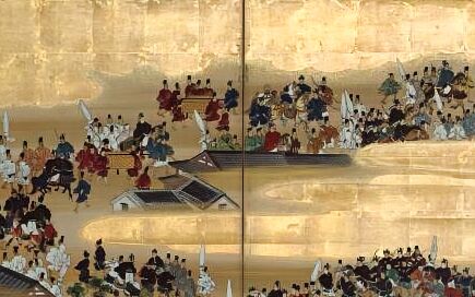 大阪歴史博物館の研究紀要には、寛政2年の光格天皇遷幸行列の編成次第が整理されていて、第18番目:主鈴(駅鈴を担ぐ役)第23番目:天皇の鳳輦(鳳輦: ほうれん=天皇の乗輿)とある。屏風は右隻=行列の出発(聖護院側から三条大橋を渡る場面)左隻=行列の市中を進み、新御所へ向かう場面。