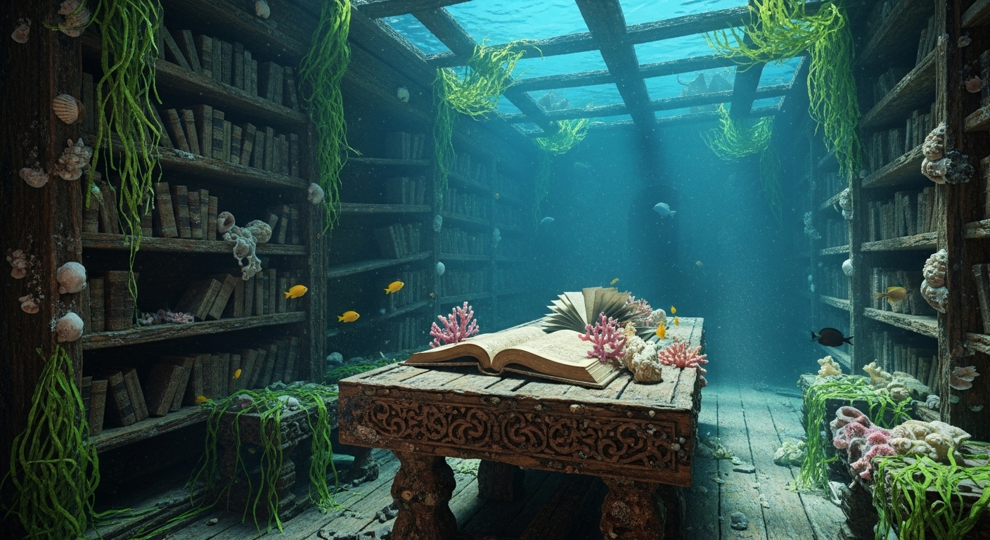Inside a sunken wooden ship, an old library-like space remains intact. Bookshelves and a carved table are partially covered in seaweed and shells. An open book rests with coral growing around it. The atmosphere is quiet, mysterious, and filled with filtered blue-green light. | 沈んだ木造船の内部に残る古い図書室のような空間。棚やテーブルに海藻や貝が絡み、開かれた本のまわりには珊瑚が育っている。神秘的で静寂に包まれた空間。 |