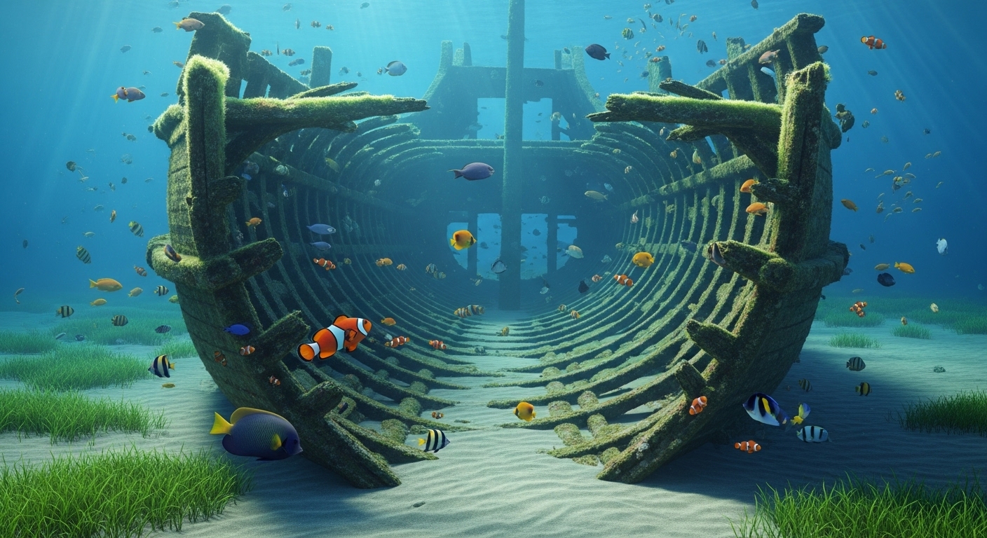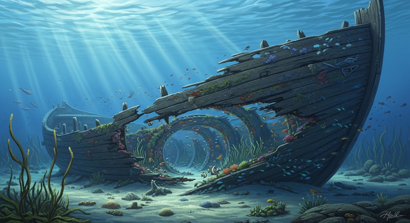 A large wooden shipwreck lying on the ocean floor, half buried in sand. The hull is broken but intact enough to reveal passageways filled with marine life. Soft beams of light filter down from the surface, revealing seaweed and colorful fish moving around. Peaceful and cool tones. | 砂に半分埋もれた大きな木造の難破船。船体は破損しつつも構造を保ち、内部には海の生き物たちが暮らしている。水面から光が差し込み、涼しげで静かな雰囲気。 |