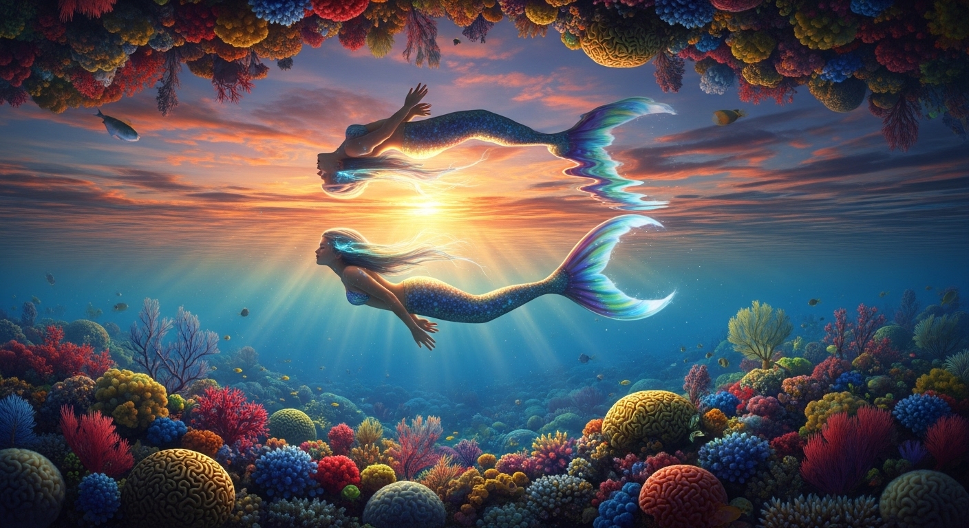 An underwater scene where the surface of the water perfectly mirrors the sky above. A mermaid swims just beneath the surface, her body reflecting in the water like a dream. Coral reefs extend below her, blending with the reflected clouds and sun. Peaceful and surreal. | 空を鏡のように映す水面。そのすぐ下を泳ぐ人魚の姿が幻想的に反射する。雲と太陽がサンゴ礁と一体化する夢のような風景。 |