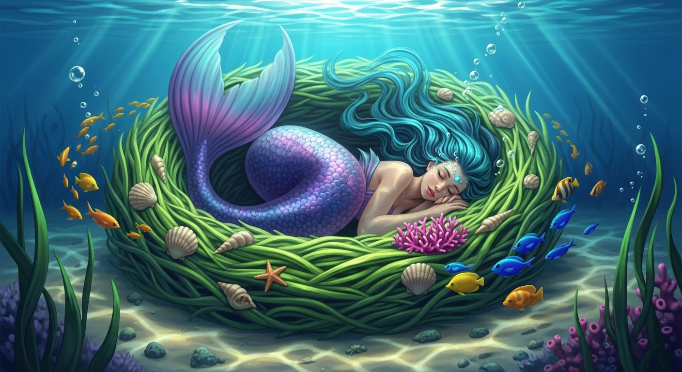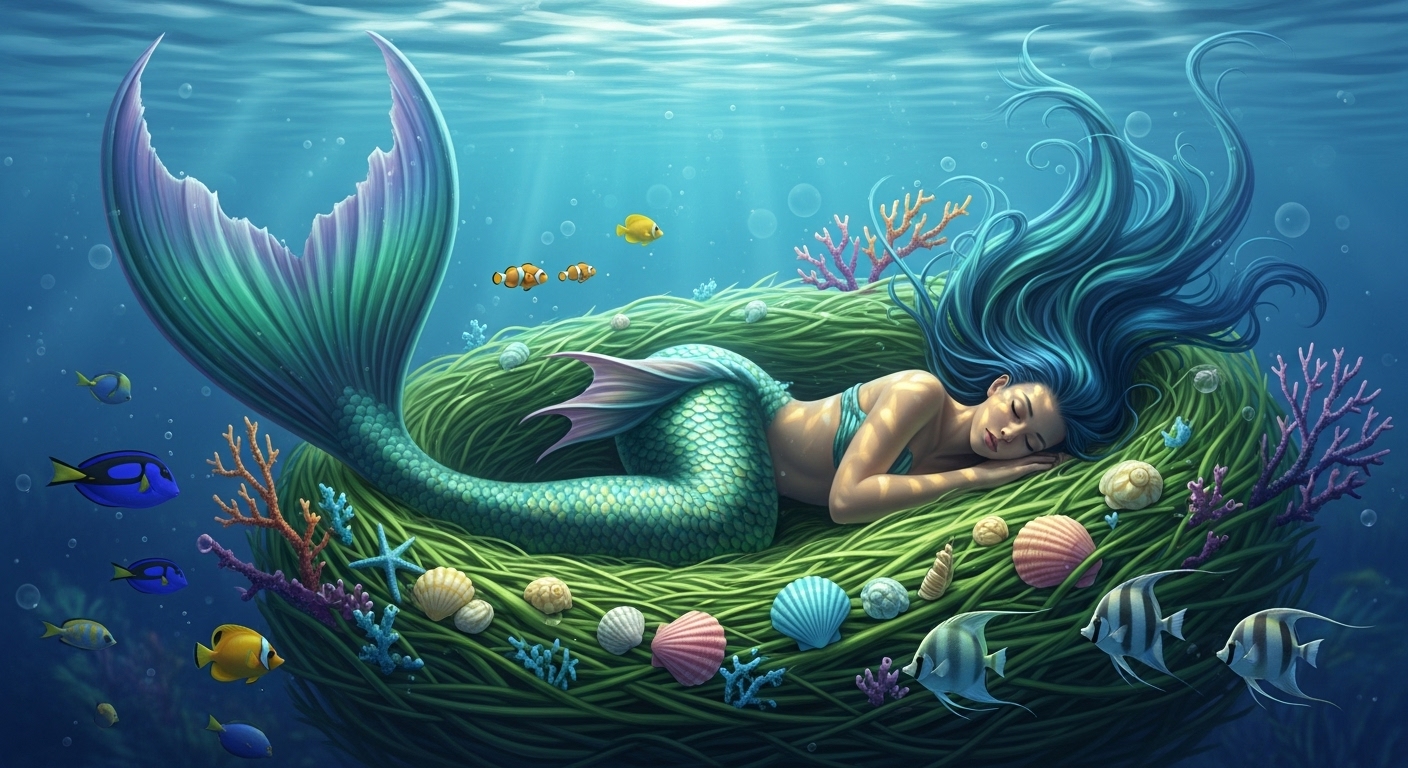 A serene scene of a mermaid sleeping curled up inside a soft underwater nest made of seagrass, shells, and coral. Her peaceful face is illuminated by faint ambient light. Colorful fish swim quietly nearby. Dreamlike, gentle composition with a sense of intimacy and quiet. | 海藻・貝・珊瑚でできた柔らかな巣で、眠る人魚の静かな表情。淡い光が包み、周囲には熱帯魚が静かに泳ぐ。親密で穏やかな夢のような構図。 |