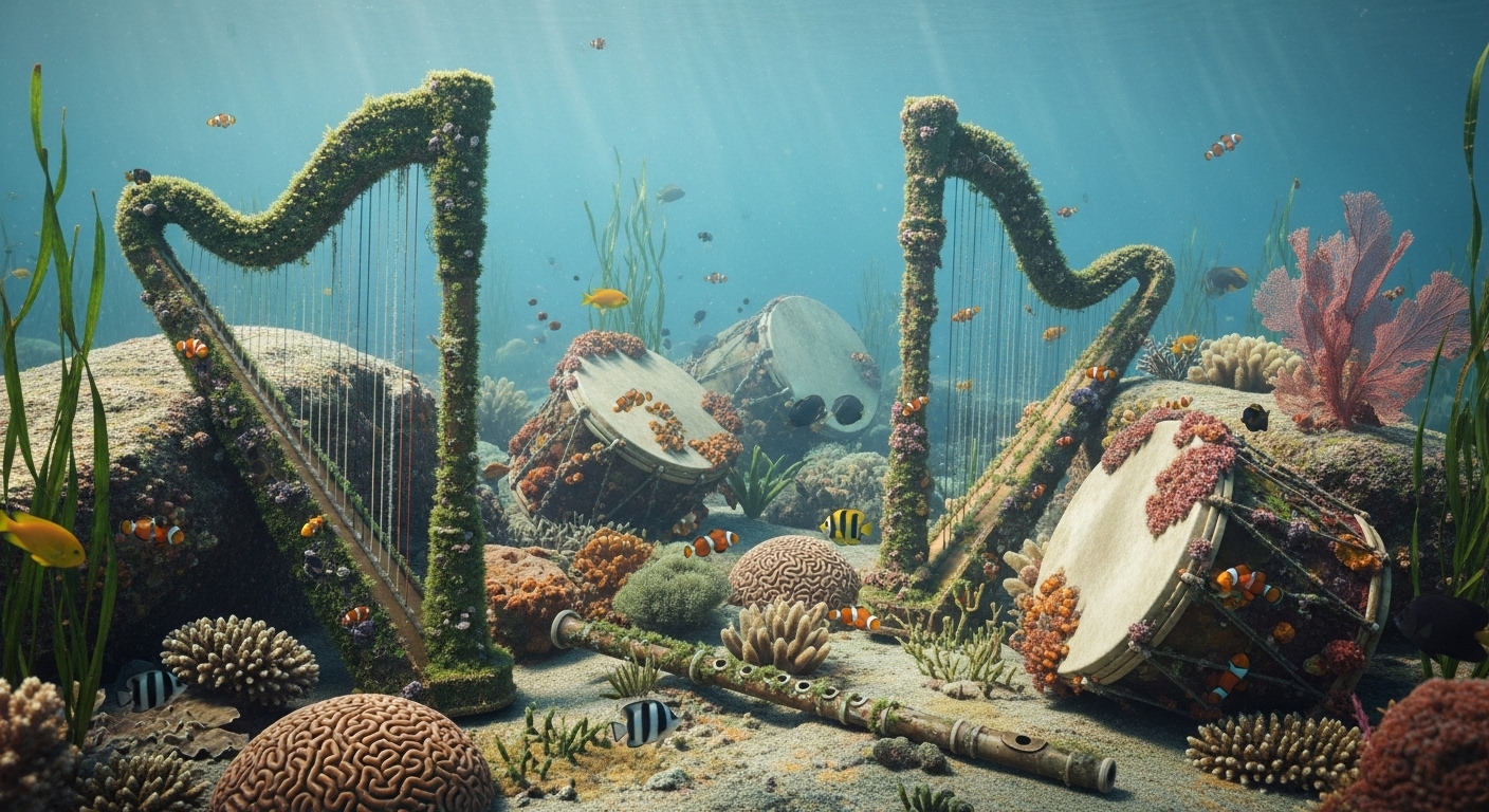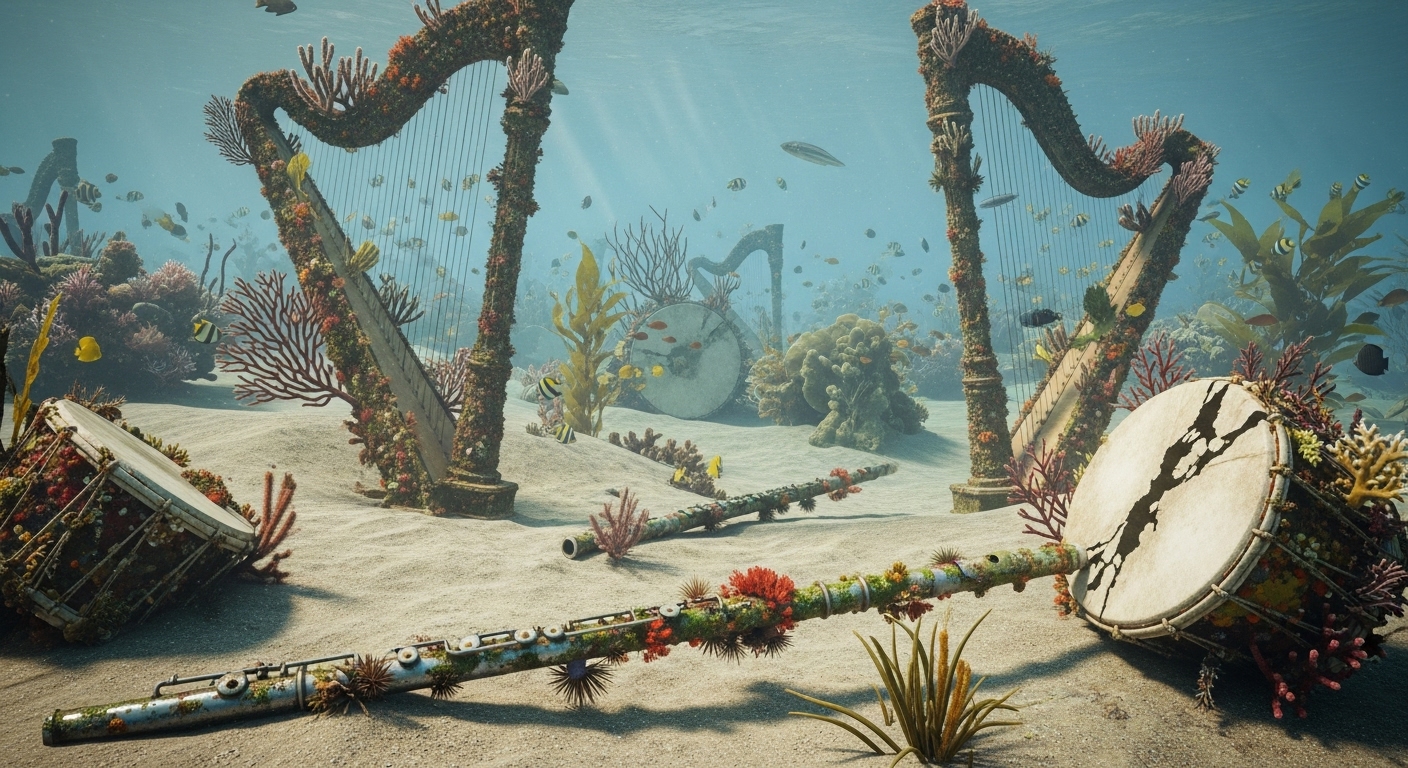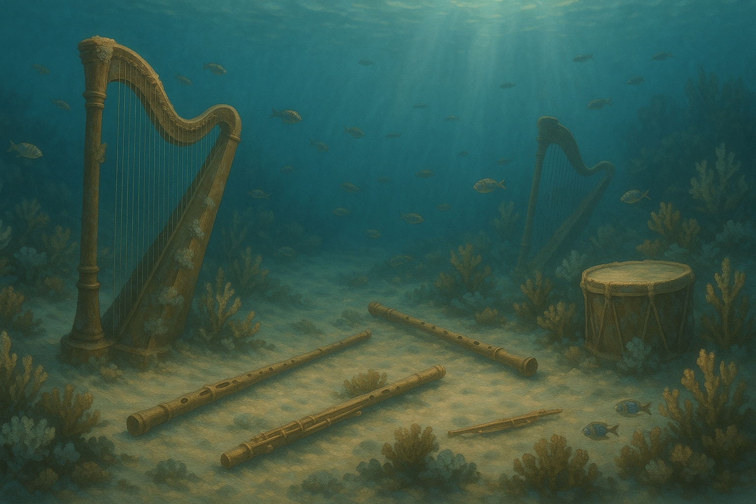 Scattered across the ocean floor are musical instruments—harps, flutes, and drums—partially buried in sand and overgrown with coral and sea plants. Fish weave through the scene. The colors are soft and subdued, with shafts of light bringing out the textures of aged wood and coral. | 海底に散らばるハープやフルートなどの楽器。砂に埋もれ、珊瑚や海藻が覆い、魚がその間を泳ぐ。古びた木と珊瑚の質感を光が静かに照らす。 |