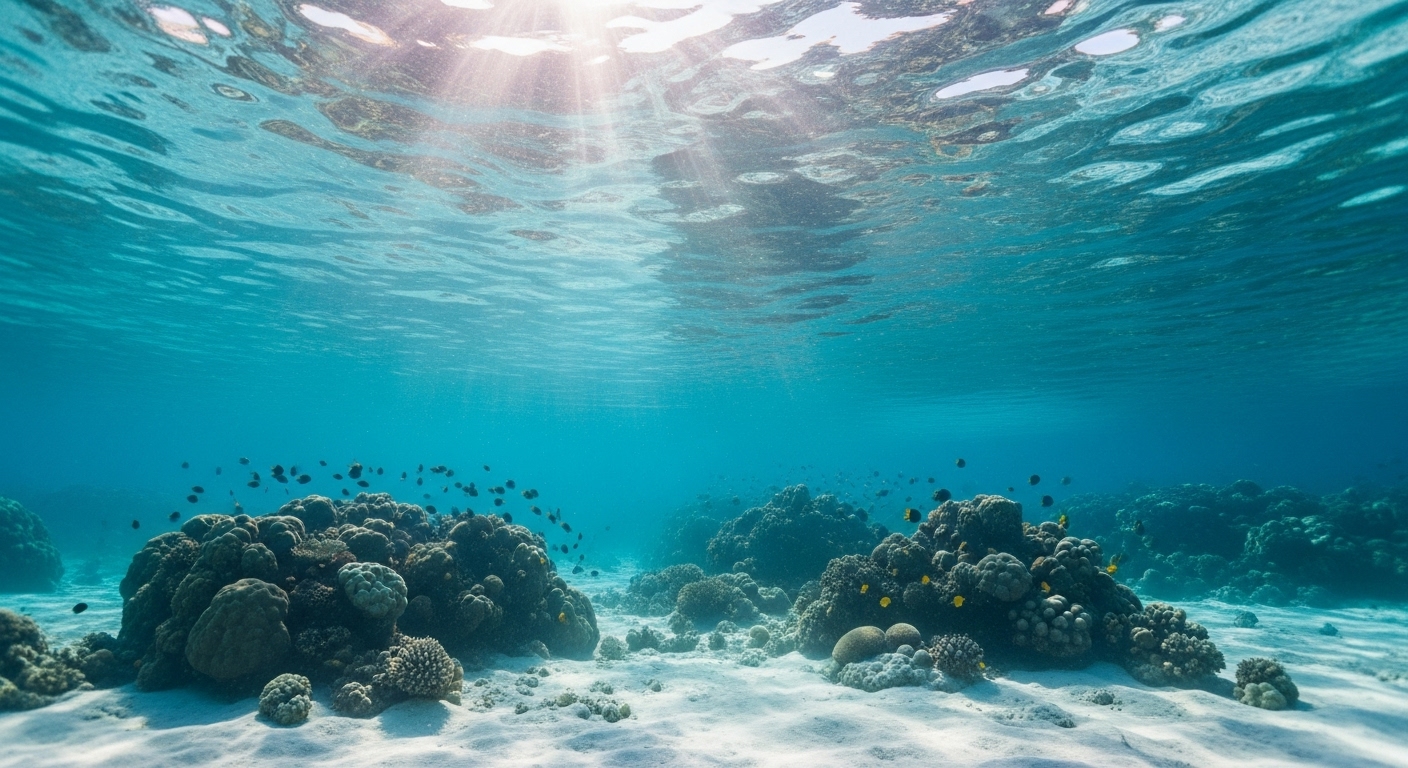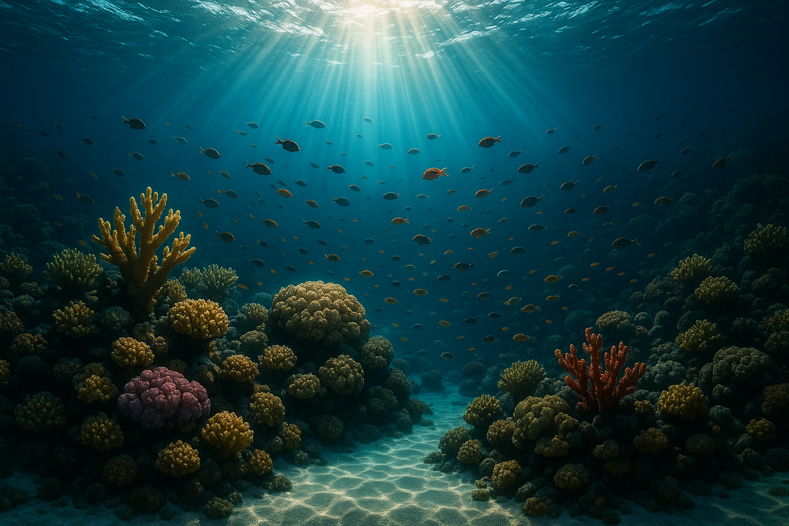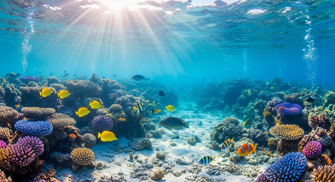 A breathtaking underwater scene in a shallow coral reef. Sunlight rays pierce through the gently rippling water surface, illuminating colorful coral formations and schools of tropical fish. The sandy ocean floor sparkles in the light. Ultra-detailed, dreamy atmosphere, high contrast between light and shadow. | 浅瀬のサンゴ礁に広がる息をのむような水中風景。揺れる水面から差し込む陽光が、色とりどりのサンゴと熱帯魚の群れを照らす。砂地の海底は光にきらめき、夢のような雰囲気に包まれている。 |