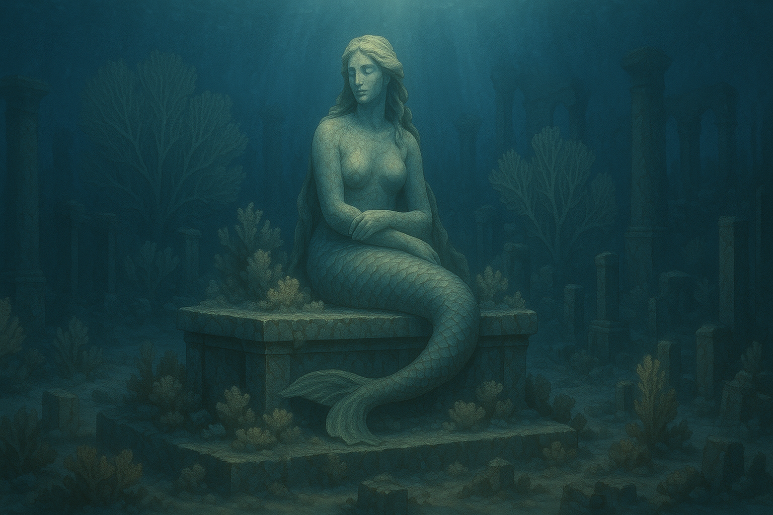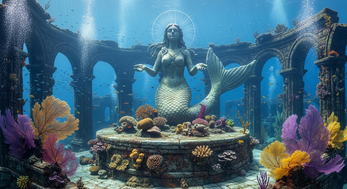 A majestic underwater scene featuring a large mermaid statue resting on a coral-covered stone altar. Surrounded by fan corals and ancient ruins, the statue appears worshipped and untouched. The lighting is cold and divine, enhancing the sense of ancient reverence. | サンゴに覆われた石の祭壇の上に立つ人魚像。扇状のサンゴや古代の遺跡に囲まれ、神聖で冷たい光が崇拝された雰囲気を引き立てる。 |