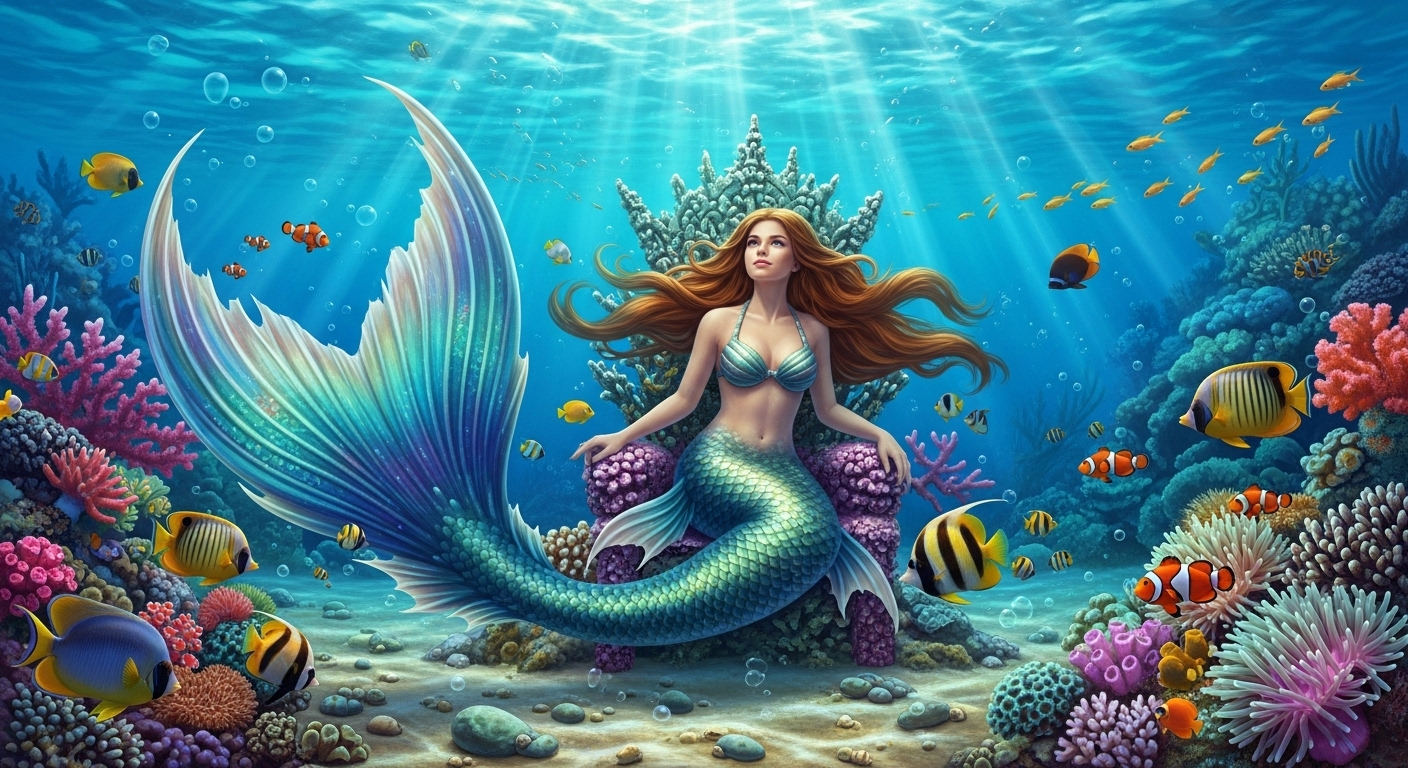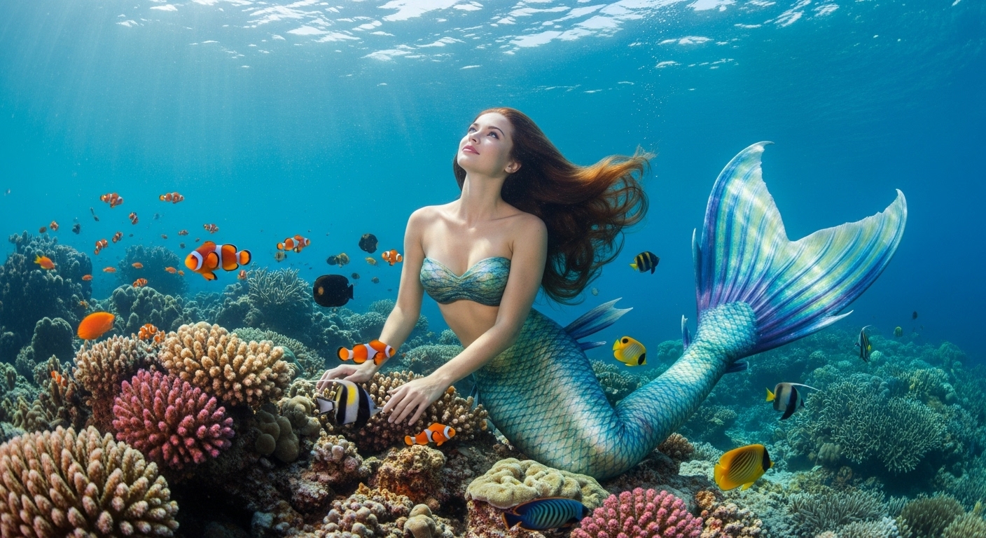 A beautiful mermaid with long flowing hair sits gracefully among vibrant coral, playfully surrounded by tropical fish. Her shimmering tail reflects the blue and green hues of the water. Gentle sunlight filters through the surface, creating a serene and magical feeling. | 長い髪をなびかせた美しい人魚が、カラフルなサンゴの間で優雅に座り、熱帯魚と戯れる。輝く尾びれが水の青と緑を反射し、柔らかな光が神秘的な空気を醸し出す。 |