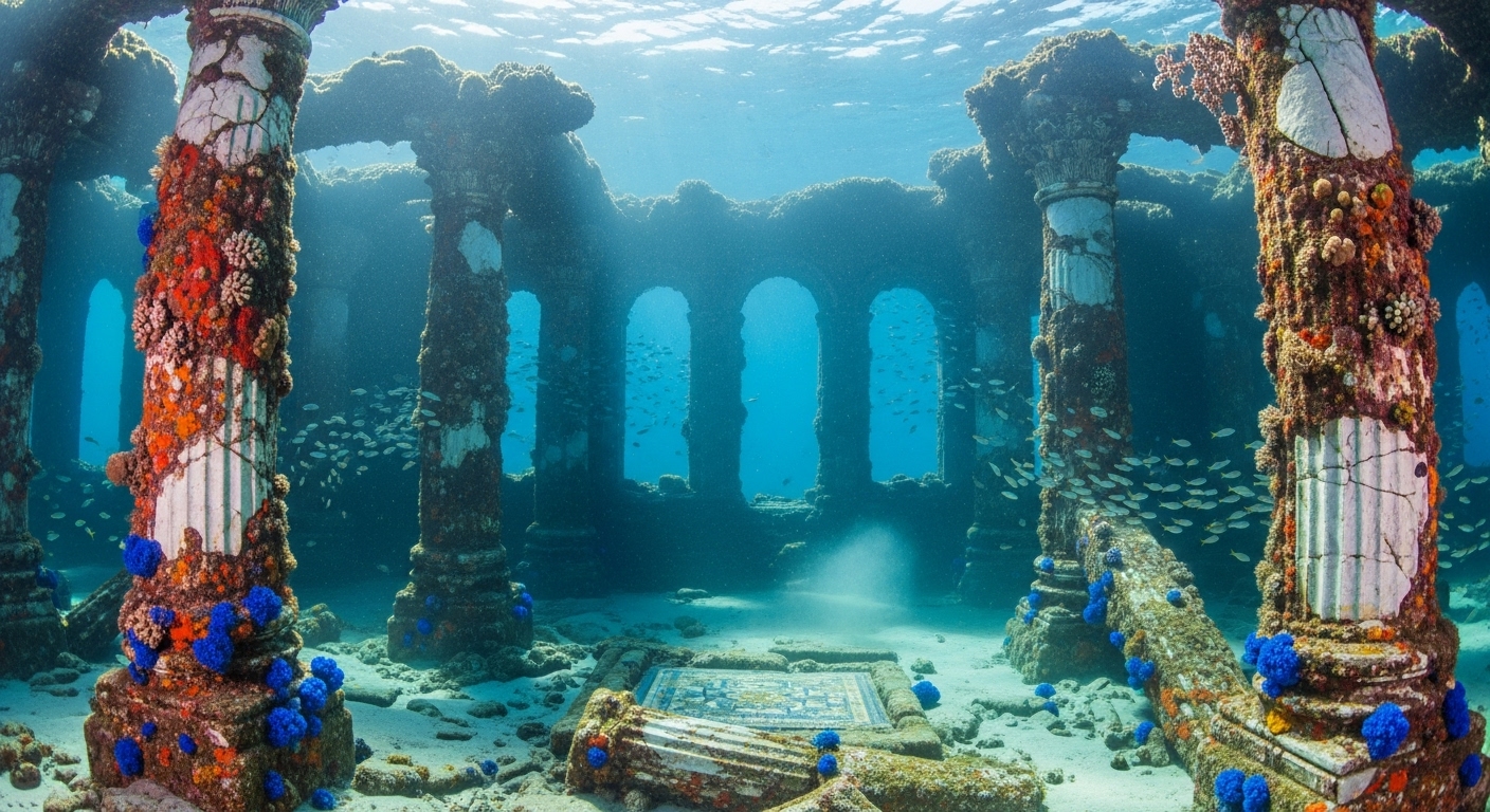 A mysterious underwater ruin of an ancient city, covered in coral and soft blue algae. Marble columns stand partially broken, with mosaic tiles faintly visible under the sand. Small fish swim through arched windows. The water is crystal clear with a magical stillness. Cinematic style. | サンゴや青い藻に覆われた古代都市の水中遺跡。壊れかけた大理石の柱、砂に埋もれたモザイク床、小魚がアーチ窓をくぐり抜ける。透き通る水と静寂が神秘的。 |