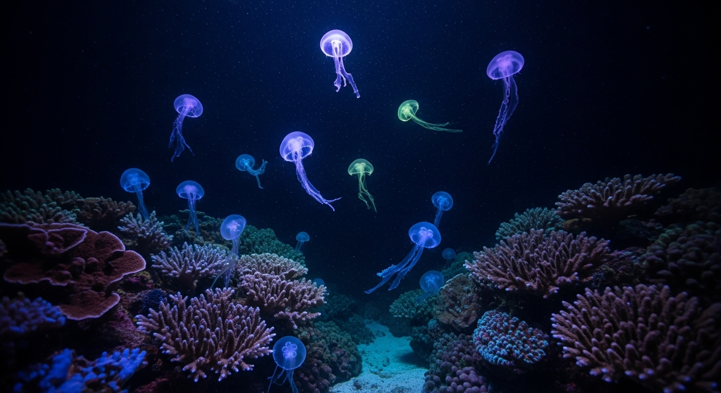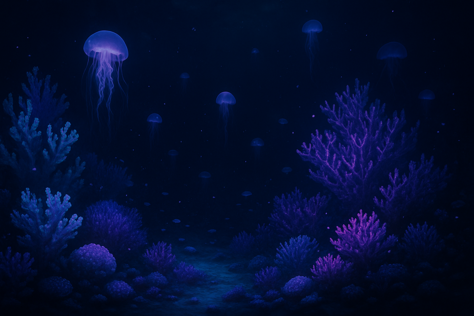 An underwater nighttime scene with glowing coral and bioluminescent jellyfish drifting gently. Purples, blues, and subtle greens fill the dark water, creating a mystical and tranquil landscape. No humans, only nature glowing softly in the darkness. Ethereal and magical mood. | 発光するサンゴとクラゲが漂う水中の夜景。青紫や緑の淡い光が暗い水中を満たし、幻想的で静かな風景が広がる。人の気配はなく、自然の神秘が光る空間。 |