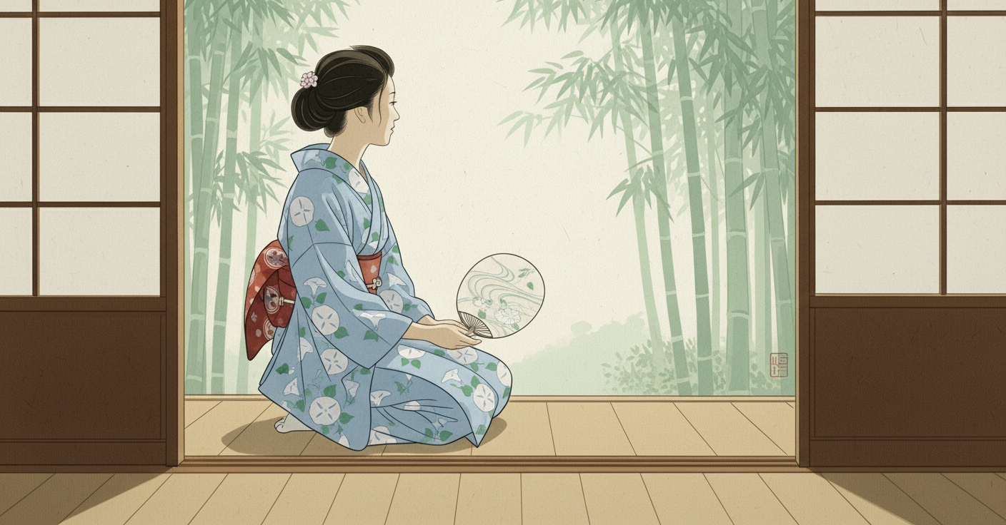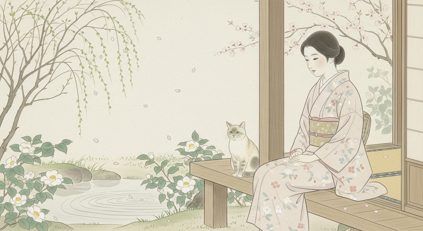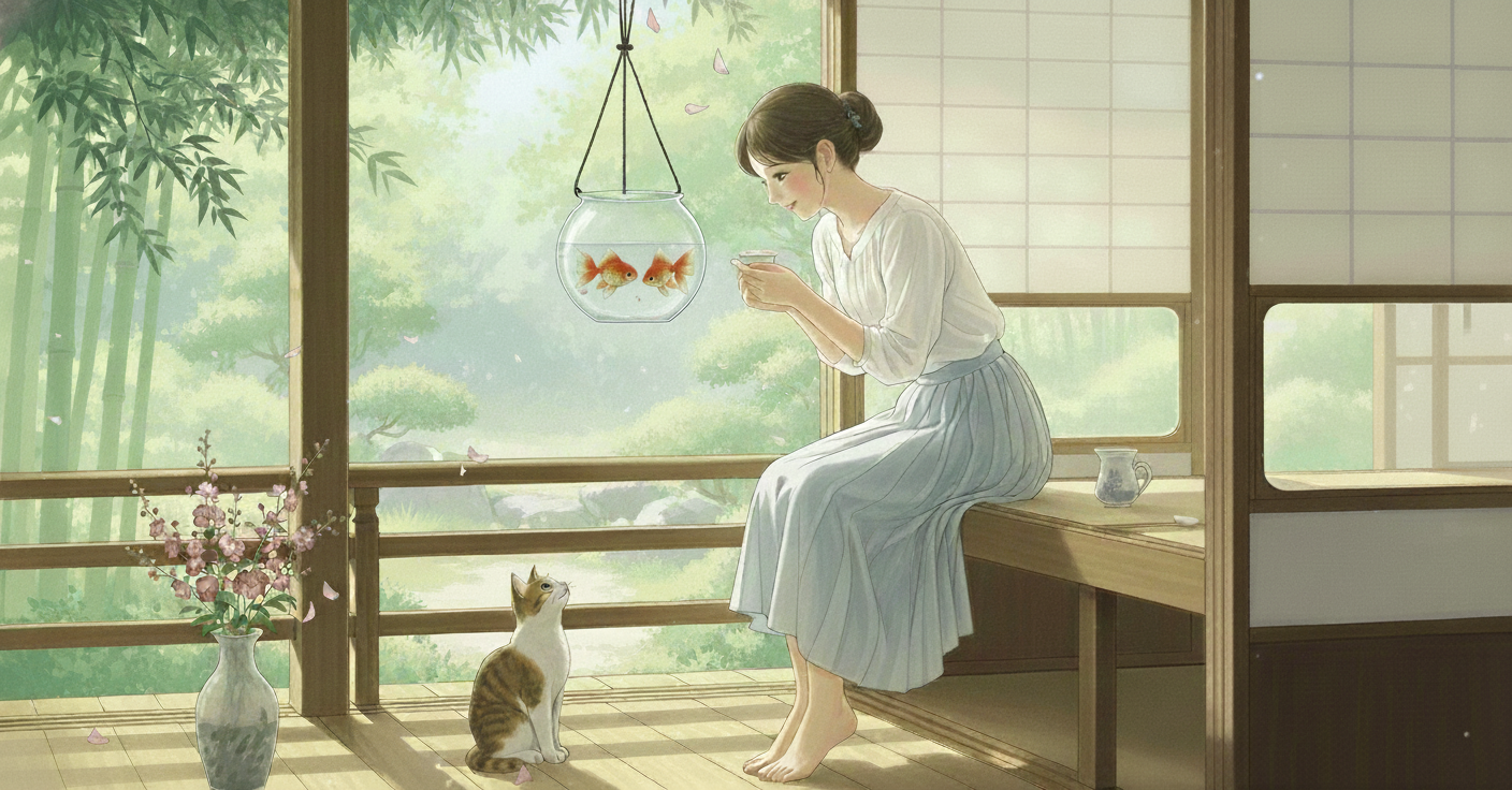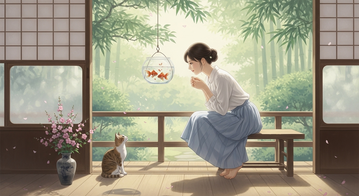プロンプト ⑥: Uemura Shoen style Japanese Nihonga painting, 上村松園風の日本画で、 depicting a calm summer afternoon on a wooden veranda, 穏やかな夏の午後の縁側を描いている。 a young Japanese woman in a soft white blouse and pale blue skirt, barefoot, 柔らかな白いブラウスと淡い青のスカートを身に着け、裸足の若い日本女性が、 gently leaning forward with a serene smile as she looks at a hanging glass bowl containing two graceful goldfish, 穏やかな微笑みを浮かべながら、二匹の優雅な金魚の入った吊りガラス鉢を覗き込むように、そっと身を乗り出している。 beside her sits a small cat quietly gazing upward at the fish. 彼女のそばには、小さな猫が静かに座り、金魚を見上げている。 Behind them, softly glowing paper shoji screens and a tranquil Japanese garden filled with lush green leaves and dappled sunlight filtering through the bamboo. 背後には、柔らかく光を通す障子と、竹の間から木漏れ日が差し込む緑豊かな静かな日本庭園が広がっている。 A small vase near the veranda holds delicate pink Nadeshiko flowers, gently swaying in the warm breeze. 縁側のそばには小さな花瓶があり、優しい風に揺れる淡い桃色の撫子の花が活けられている。 The entire scene is illuminated by diffused natural light, with no hard shadows and no strong contrast — この情景全体は拡散した自然光に包まれ、強い影やコントラストは見られない。 painted entirely without visible outlines, no black or dark contour lines anywhere. どこにも黒や濃い輪郭線を用いず、完全に輪郭線のない描法で描かれている。 Edges dissolve softly into surrounding colors, forms defined only by subtle tonal transitions and the gentle blending of hues. 輪郭は周囲の色に柔らかく溶け込み、形は繊細な色調の移り変わりと穏やかな色のにじみによってのみ表現されている。 Shadows appear as faint layers of cool translucent tones, never dark. 影は冷たく透明感のある淡い層として現れ、決して暗くはならない。 All textures appear slightly matte, as if painted on silk using mineral pigments in thin translucent washes. すべての質感はわずかに艶を抑えた仕上がりで、絹地に岩絵具の薄い透明な層を重ねて描かれたかのように見える。 The brushwork is airy and softly diffused, creating a silken mist-like texture across the entire surface. 筆づかいは軽やかで柔らかく、画面全体に絹のような霞がかった質感を生み出している。 The atmosphere is serene, poetic, and timeless, evoking the tender stillness and clarity of an Uemura Shoen painting. その雰囲気は静謐で詩情に満ち、上村松園の作品に見られる優しい静けさと清澄さを思わせる。 9:16 aspect ratio, Japanese painting texture, softly glowing summer light. アスペクト比9:16、日本画の質感、そして柔らかに輝く夏の光。 参考) 線を消す : “no visible outlines” と “edges dissolve softly” の二重指定で輪郭線の発生を抑制。 陰影を柔らげる : “no hard shadows”, “faint translucent tones” で陰影のコントラストを抑制。 絹地の滲み : “silken mist-like texture” と “mineral pigments in translucent washes” で絹本日本画の質感再現。 空気と光の統一 : “diffused natural light”+“softly glowing summer light” で画面全体に一体感を作る。