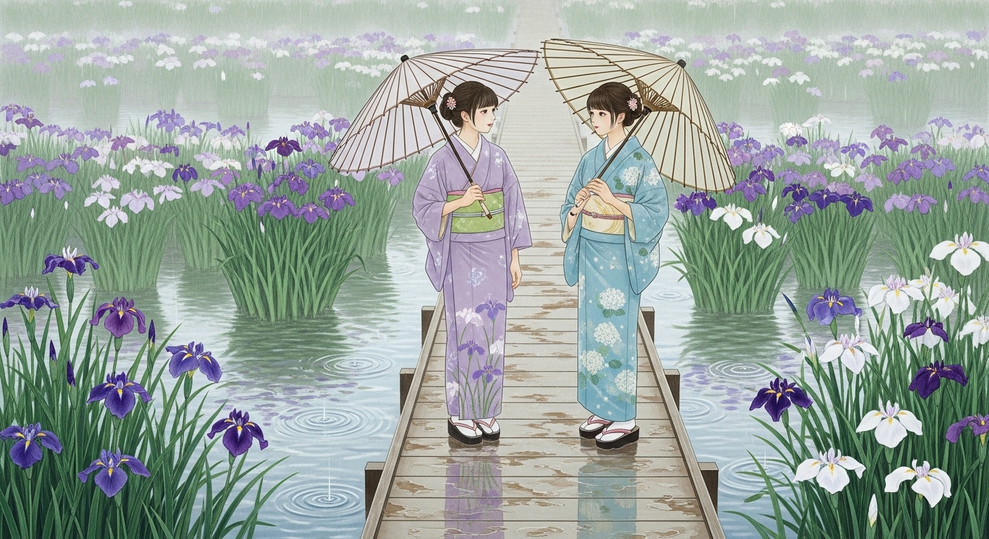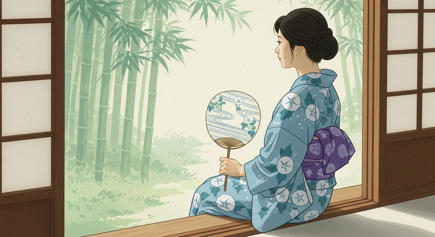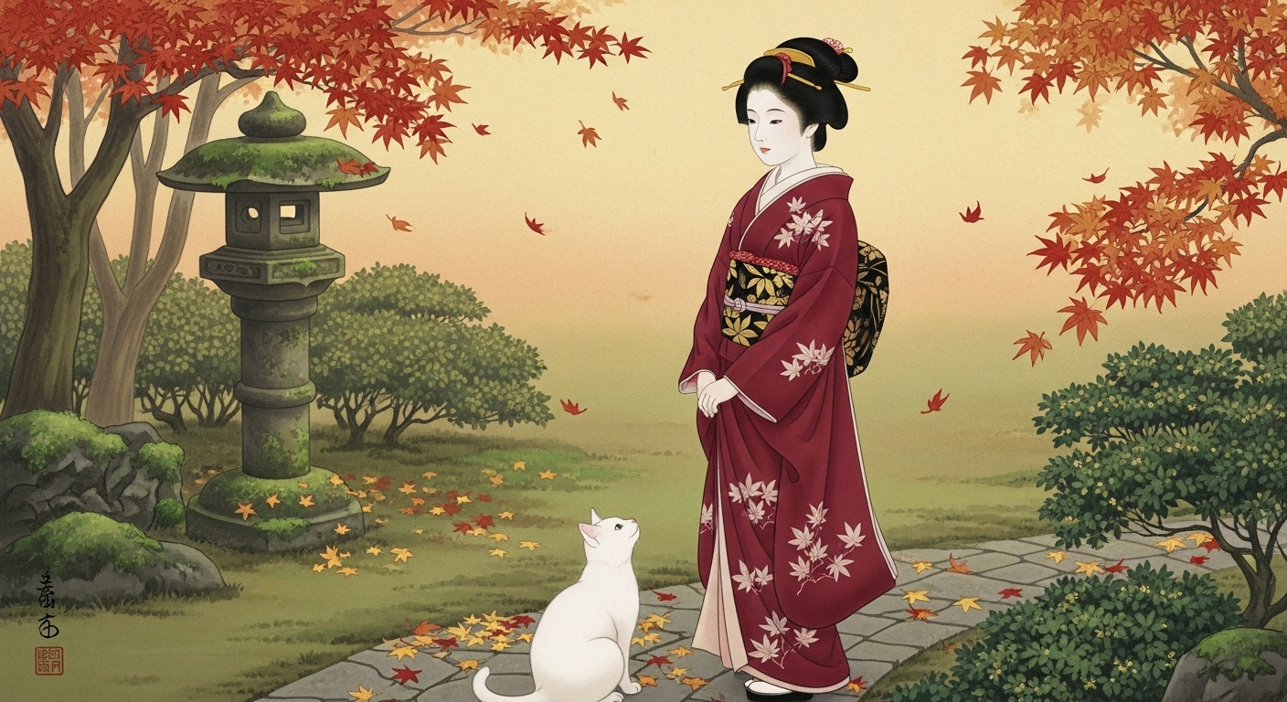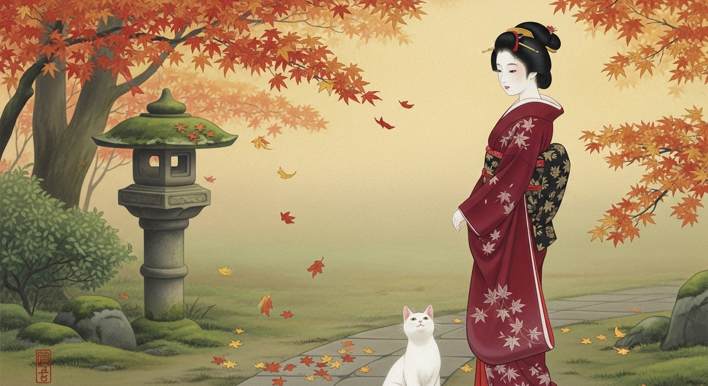 プロンプト ⑥: Uemura Shoen style Japanese Nihonga painting, 上村松園風の日本画で、 depicting a calm summer afternoon on a wooden veranda, 穏やかな夏の午後の縁側を描いている。 a young Japanese woman in a soft white blouse and pale blue skirt, barefoot, 柔らかな白いブラウスと淡い青のスカートを身に着け、裸足の若い日本女性が、 gently leaning forward with a serene smile as she looks at a hanging glass bowl containing two graceful goldfish, 穏やかな微笑みを浮かべながら、二匹の優雅な金魚の入った吊りガラス鉢を覗き込むように、そっと身を乗り出している。 beside her sits a small cat quietly gazing upward at the fish. 彼女のそばには、小さな猫が静かに座り、金魚を見上げている。 Behind them, softly glowing paper shoji screens and a tranquil Japanese garden filled with lush green leaves and dappled sunlight filtering through the bamboo. 背後には、柔らかく光を通す障子と、竹の間から木漏れ日が差し込む緑豊かな静かな日本庭園が広がっている。 A small vase near the veranda holds delicate pink Nadeshiko flowers, gently swaying in the warm breeze. 縁側のそばには小さな花瓶があり、優しい風に揺れる淡い桃色の撫子の花が活けられている。 The entire scene is illuminated by diffused natural light, with no hard shadows and no strong contrast — この情景全体は拡散した自然光に包まれ、強い影やコントラストは見られない。 painted entirely without visible outlines, no black or dark contour lines anywhere. どこにも黒や濃い輪郭線を用いず、完全に輪郭線のない描法で描かれている。 Edges dissolve softly into surrounding colors, forms defined only by subtle tonal transitions and the gentle blending of hues. 輪郭は周囲の色に柔らかく溶け込み、形は繊細な色調の移り変わりと穏やかな色のにじみによってのみ表現されている。 Shadows appear as faint layers of cool translucent tones, never dark. 影は冷たく透明感のある淡い層として現れ、決して暗くはならない。 All textures appear slightly matte, as if painted on silk using mineral pigments in thin translucent washes. すべての質感はわずかに艶を抑えた仕上がりで、絹地に岩絵具の薄い透明な層を重ねて描かれたかのように見える。 The brushwork is airy and softly diffused, creating a silken mist-like texture across the entire surface. 筆づかいは軽やかで柔らかく、画面全体に絹のような霞がかった質感を生み出している。 The atmosphere is serene, poetic, and timeless, evoking the tender stillness and clarity of an Uemura Shoen painting. その雰囲気は静謐で詩情に満ち、上村松園の作品に見られる優しい静けさと清澄さを思わせる。 9:16 aspect ratio, Japanese painting texture, softly glowing summer light. アスペクト比9:16、日本画の質感、そして柔らかに輝く夏の光。 参考) 線を消す : “no visible outlines” と “edges dissolve softly” の二重指定で輪郭線の発生を抑制。 陰影を柔らげる : “no hard shadows”, “faint translucent tones” で陰影のコントラストを抑制。 絹地の滲み : “silken mist-like texture” と “mineral pigments in translucent washes” で絹本日本画の質感再現。 空気と光の統一 : “diffused natural light”+“softly glowing summer light” で画面全体に一体感を作る。