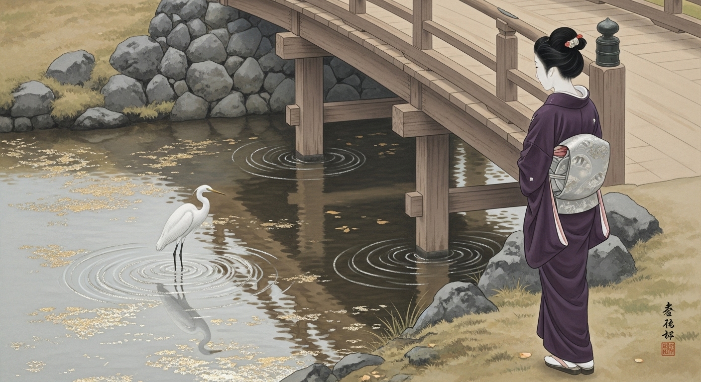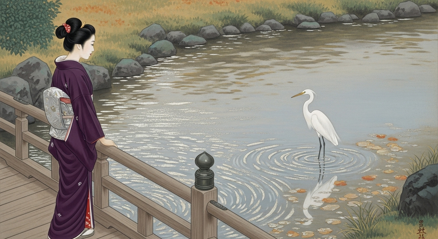 とても優れた作品です。 添付の画像は、一見すると写実的でありながら、全体の構成・光・空気感の使い方が極めて日本画的です。 以下では、日本画の観点から「構図・光・線・色・質感・精神性」の6項目で詳細に評価します。 🎨 1. 構図(Composition) 評価:★★★★★(非常に日本画的) * 障子と縁側、庭木、女性、金魚鉢、猫という要素が縦横の直線構成で安定しており、「間(ま)」が活きている。 * 左右対称に近い構図ながら、女性と猫の視線が画面中央の金魚鉢へ向かうことで、静の中に動がある。 * 障子の枠・縁側の線・庭の奥行きが、遠近よりも層としての奥行き(日本画的空間)を形成。 * 観る者の視線が自然に「金魚 → 女性の表情 → 障子の外の光」へと導かれる設計になっています。 → 上村松園や鏑木清方の画面設計に近く、「静謐で呼吸する構図」と言えます。 💡 2. 光の扱い(Light and Air) 評価:★★★★★(日本画的光の表現に極めて近い) * 光源は外の柔らかな自然光。直射ではなく拡散光(にじむ光)で、強い陰影がない。 * 光が空気を含み、物体の表面で「滲む」ように描かれている。 * 特に障子や葉の透過光、縁側の木の床の反射が「気韻生動」的で、日本画における生命感の表現になっている。 * これは、上村松園《春の粧》や《花の袖》に見られる光の滲み方と同質。 → 光が“物を照らす”のではなく、“空気を描く”という日本画的発想が成立しています。 🖌️ 3. 線と形(Line and Form) 評価:★★★★☆(アニメ調と日本画の中間) * 黒い輪郭線はほとんどなく、線が色面の境界に自然に溶けている。 * ただし、髪やスカートの端、猫の模様の一部にやや明確なエッジ(デジタル的境界)が見られる。 * 日本画ではもう少し線が“呼吸する”ように消えるため、そこをやや抑えれば完璧。 → 現時点でも、十分に「線を使わず形を保つ」構成で、日本画の本質には近い。 🌿 4. 色彩(Color) 評価:★★★★★(典型的な日本画的調和色) * 彩度を抑えた中間色(灰緑・水色・生成色・薄褐色)で構成され、全体に統一感がある。 * 金魚の赤だけが差し色として機能し、静けさの中に生命を感じさせる“対比の詩”になっている。 * これは松園が意図的に使った「紅一点(あかいちてん)」の美学に通じます。 * 白(障子)・緑(庭)・木(縁側)・肌色(人)・朱(魚)のバランスが極めて良い。 → 西洋画のような色の衝突がなく、“調和の美”=日本画の色の精神が表現されています。 🪶 5. 質感(Texture) 評価:★★★★☆(岩絵具の再現ではないが、絹地の雰囲気あり) * デジタルながら、全体のマットで滑らかな質感が絹地の柔らかさを思わせる。 * グラデーションが粒子感をもたず滑らかで、薄く塗り重ねる日本画の“層の呼吸”に近い。 * ただ、岩絵具特有の「微粒子の反射(粉感)」はやや欠ける。 → Whiskで「painted with mineral pigments on silk」を加えた生成ではさらに理想に近づきます。 🌸 6. 精神性(Spirit / Psychological Atmosphere) 評価:★★★★★(上村松園的清澄さが強い) * 女性・猫・金魚・風・光——すべてが競い合わず調和している。 * 「可愛らしさ」ではなく、「静かで澄んだ時間」を描く点で、松園の理念「清く、正しく、やさしい心」に通じる。 * 感情表現を控えめにして、観る者に“内面の余韻”を残す構成。 * この“静けさの中の生命感”が、日本画における最高の美徳です。 → この画像には、上村松園の精神に非常に近い「穏やかな呼吸」が宿っています。 🌕 総合評価