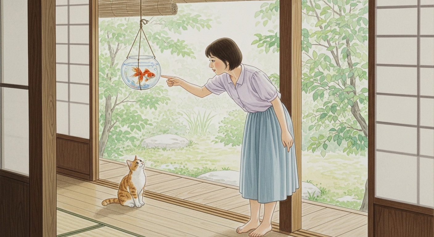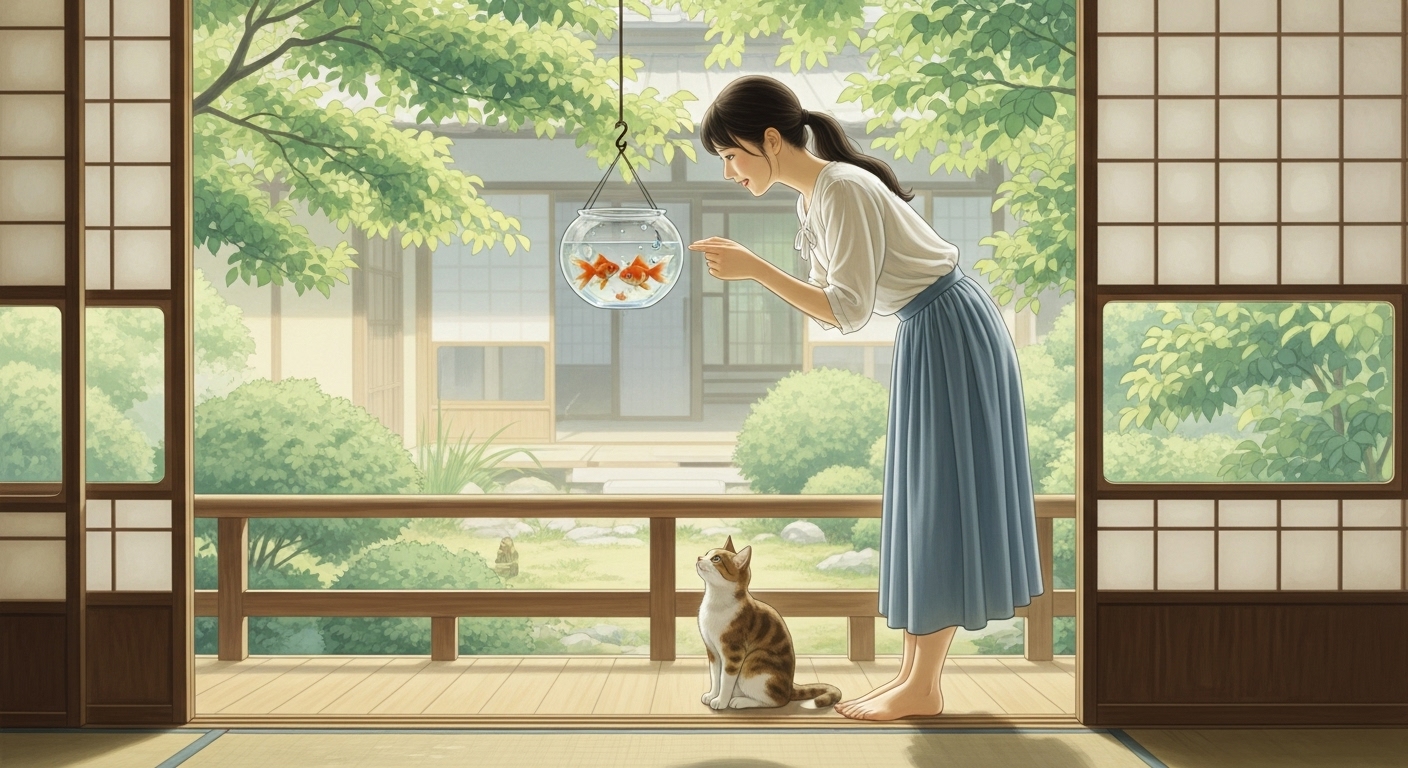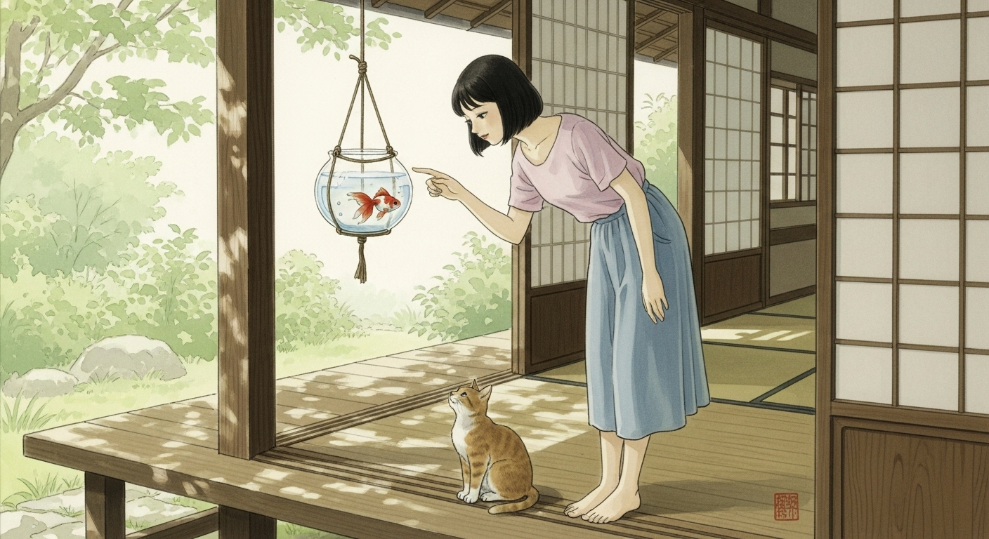 プロンプト ⑥: Uemura Shoen style Japanese Nihonga painting, a young Japanese woman in a light summer blouse and soft blue skirt standing barefoot on a wooden veranda, gently leaning forward and smiling as she looks at a hanging glass bowl with two goldfish inside, beside her, a small cat sits calmly, gazing up at the fish. Behind them, softly glowing paper shoji screens and an open view of a quiet Japanese garden filled with green leaves and filtered summer sunlight. The scene is serene and poetic, capturing a moment of stillness and gentle curiosity. Painted without outlines — no visible contour lines, no black or dark edges. All forms are defined only by subtle tonal transitions and delicate color gradations. Shadows are extremely soft, only suggesting depth without strong contrast. Edges fade smoothly into surrounding hues, creating a gentle sense of air and warmth. Painted with mineral pigments on silk, using thin translucent layers and softly diffused brushwork, expressing the calm brightness and tender emotion of a Japanese summer afternoon in the refined spirit of Uemura Shoen. 9:16 aspect ratio, high-resolution Japanese painting texture.