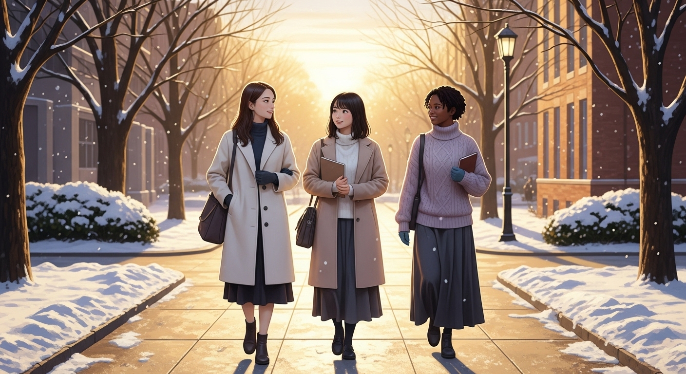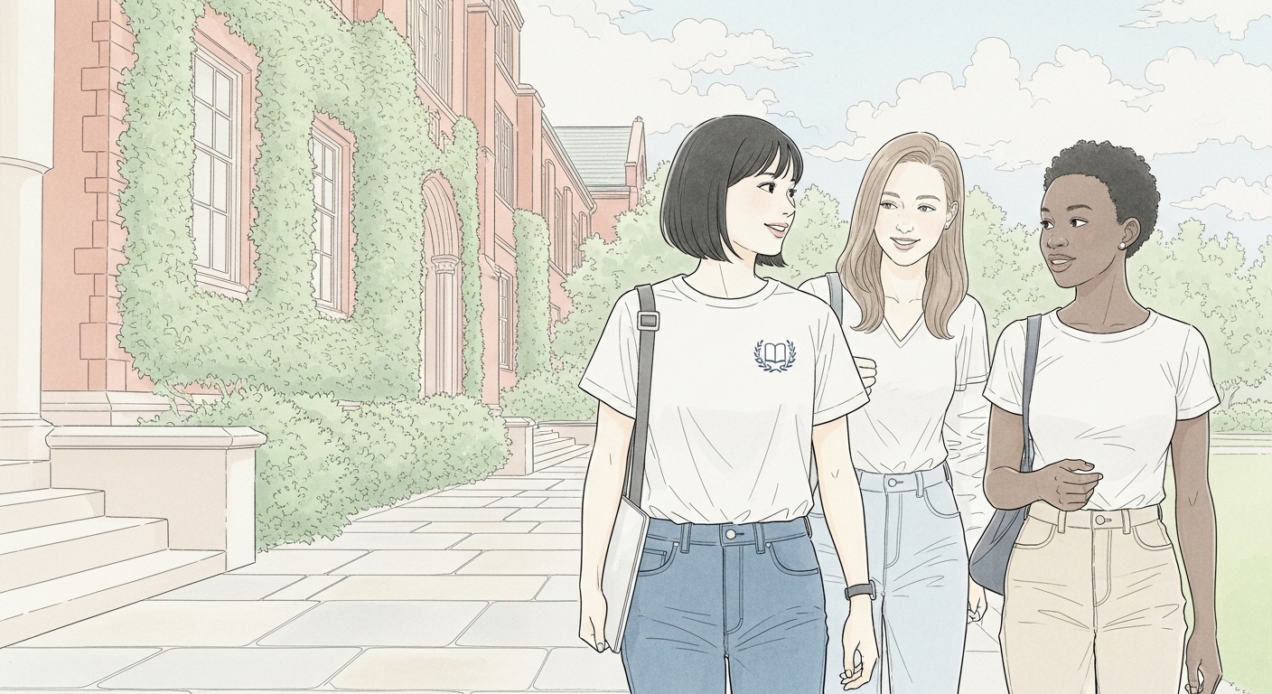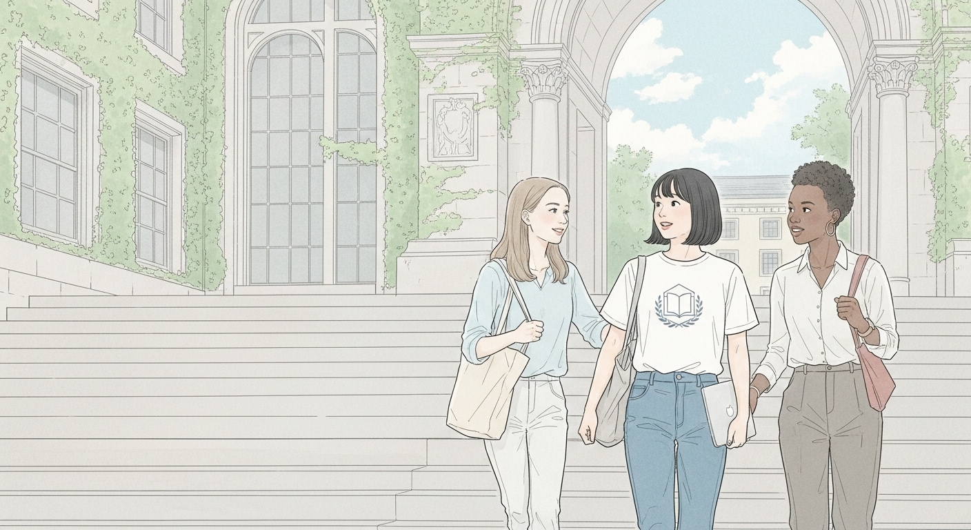プロンプト①: A refined Japanese Nihonga-style painting created on soft handmade washi paper with subtle visible fibers, painted with natural mineral pigments (iwa-enogu) for a matte, powdery texture and soft layered washes, with forms suggested by tonal transitions rather than strong contour lines, capturing the serene and elegant aesthetic of traditional Japanese painting. The composition is balanced yet slightly asymmetrical, leaving generous open space above and around the figures, and uses a mildly flattened perspective rather than strict Western linear depth. Depicted in full figure from head to toe are three young women walking close together down a broad, pale stone staircase in front of a historic, ivy-covered university library with tall arched windows and a few classical columns. The central figure, a 20-year-old Japanese woman with short black hair, wears a simple white T-shirt and straight-cut blue jeans, carrying a shoulder bag with a slim laptop partly visible inside. On the left chest pocket of her T-shirt is a small, tasteful intellectual logo — a minimalist geometric emblem resembling an open book with a subtle laurel-wreath motif, rendered in soft gray-blue, elegant and unobtrusive. Walking beside her are two friends, also depicted in full figure: one is a young Black woman with short natural hair, dressed in a simple pale blouse and tapered slacks, and the other is a young white woman with long light-brown hair, wearing a softly colored casual top and ankle-length pants. Their attire is understated and harmonious, painted in pale, desaturated mineral tones that complement the scene. The stone steps and the ivy-covered façade are painted in subtle gradations of pale mineral pigments, the background sky rendered in soft washes of pale blue and white, with no harsh shadows and no strong outlines, allowing the faint washi paper texture to remain visible beneath the color layers. The scene conveys a calm, dignified, and poetic mood, consistent with a traditional Japanese Nihonga painting while preserving the realism of modern students. 16:9 aspect ratio, full-body depiction of all figures, high-resolution Nihonga texture.