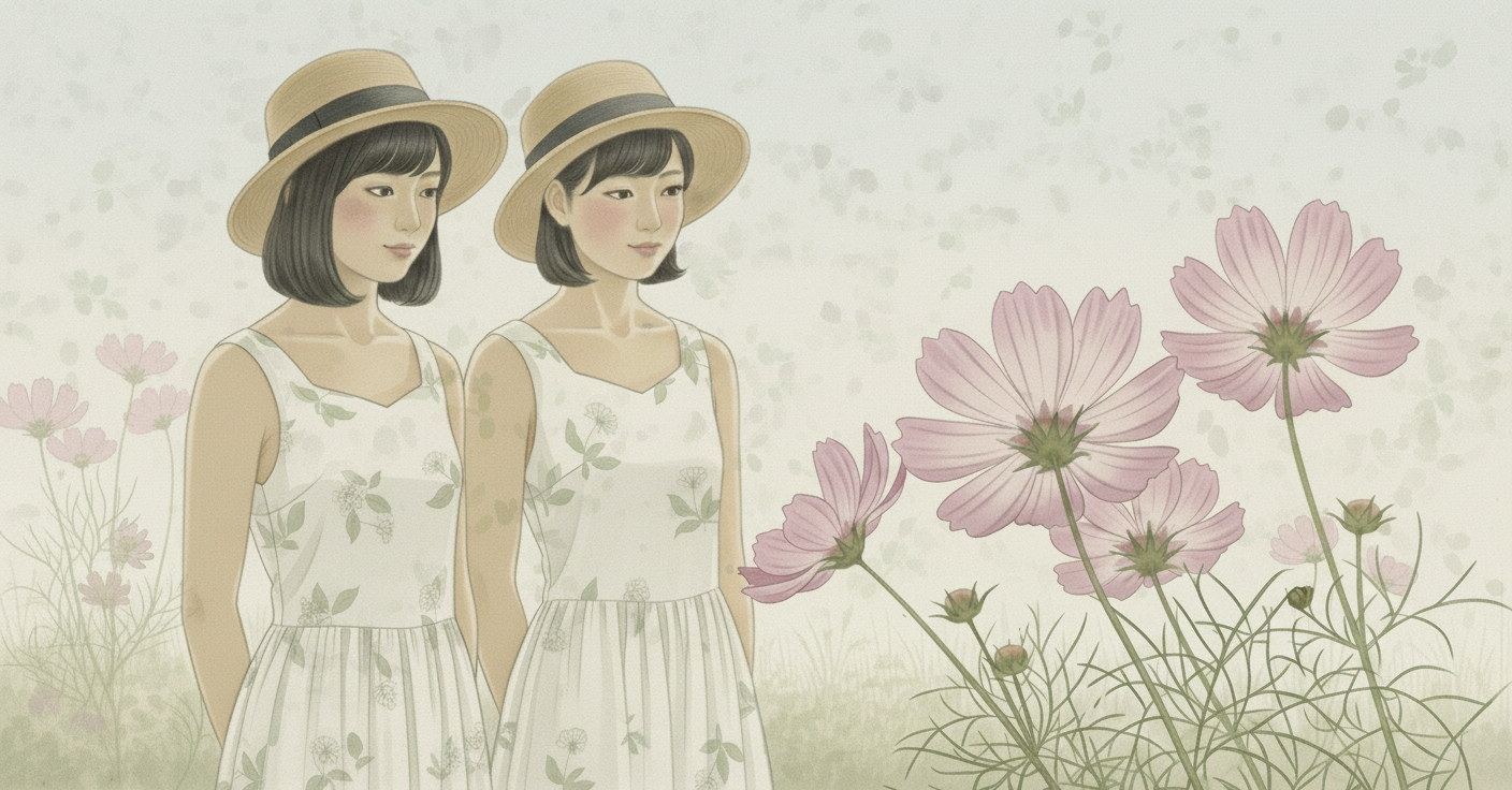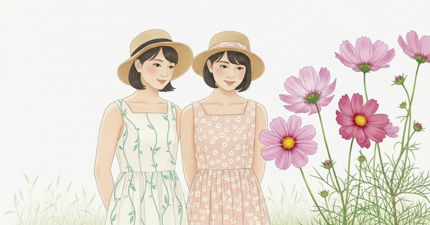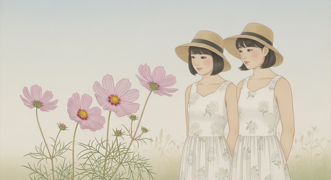 プロンプト ③: A refined traditional Japanese Nihonga-style painting on subtly textured washi paper, rendered in clear yet harmonious mineral pigments with a soft matte finish, showing vivid but elegant colors that retain the character of mineral pigments — not glossy digital neon tones, applied in layered washes with soft but distinct edges that sometimes bleed slightly into the paper fibers, capturing a luminous early autumn atmosphere in Japan. The composition is intimate and close-up, showing two young Japanese women in their early twenties, both with neat short haircuts, depicted from a viewpoint that is close enough so their full standing figures fill most of the frame, with only a hint of the soft sky and garden behind them. Both women wear simple yet graceful summer one-piece dresses of different designs: – The woman on the left wears a light cream dress with slender flowing pale-green vine motifs, paired with a simple straw hat with a rounded brim. – The woman on the right wears a soft pastel-peach dress decorated with a delicate repeating pattern of tiny white flower silhouettes, paired with a slightly wider straw hat adorned with a narrow ribbon band. They stand close together, their heads slightly inclined and their eyes gently lowered toward a cluster of vibrant cosmos flowers blooming nearby, as if pausing to admire their lively color. In the foreground, a few large cosmos flowers in lively pale-pink to deeper rosy-pink hues with rich yellow centers bloom on slender stems, their petals rendered with clear, softly layered pigment, showing natural variations in tone and subtle bleeding at the edges, creating a fresh, luminous contrast against the more neutral tones of the dresses. The cosmos petals and leaves have a slightly stronger color presence than in a faintly-toned Nihonga, yet still maintain soft mineral-pigment texture and a hand-painted look, with slight visible wavering and gentle unevenness of brushwork suggesting organic vitality. The background remains understated, with only a faint suggestion of soft pale autumn grasses and distant gentle light, leaving ample open space to enhance the poetic focus on the two women and the nearby cosmos. The overall composition is balanced and harmonious, with slightly flattened decorative spatial depth and generous open space, avoiding strong Western perspective and preserving the traditional Nihonga aesthetic. No bold black contour lines, no comic-style outlines, no sharp anime shading. All forms are defined by soft but clear tonal transitions and rich, subtly layered mineral colors, with the washi-paper texture faintly visible beneath the pigments, conveying the impression of a genuine Nihonga painting on washi with slightly more vivid seasonal colors. 16:9 aspect ratio, high-resolution Nihonga-style texture.