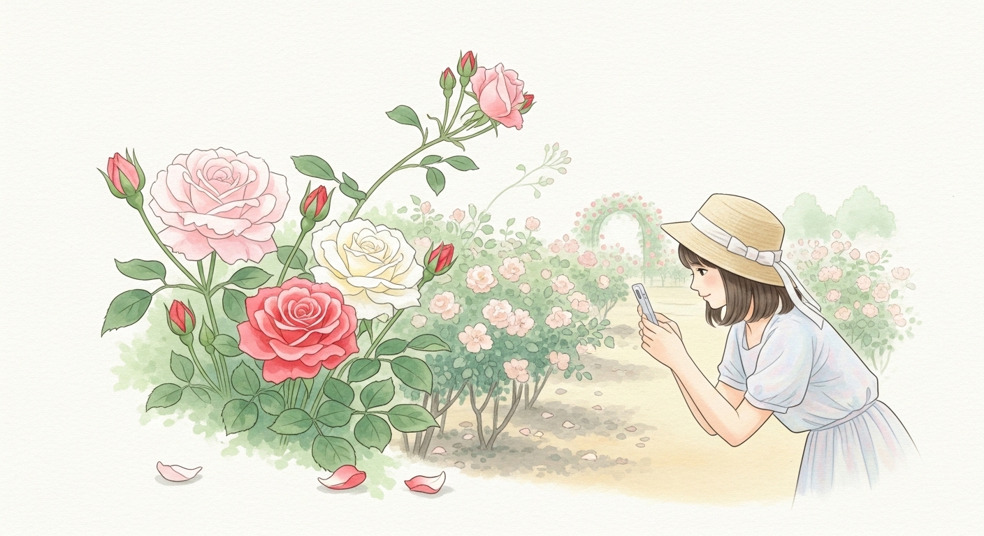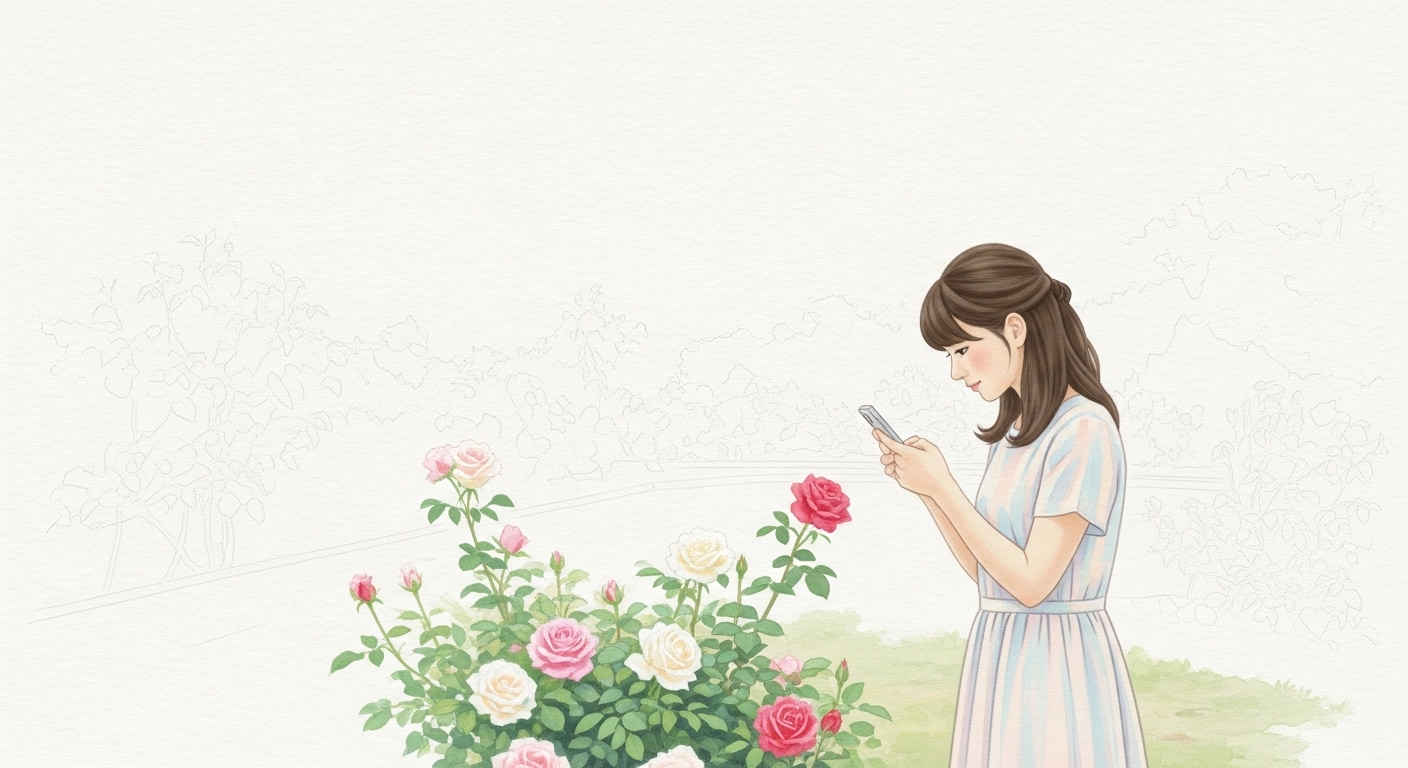 プロンプト ④: *Google Whiskでは、モデルが著名人に似ているらしく、プラクティス違反になると表示され、生成エラーになる。 修正プロンプト追加(黃色) A refined traditional Japanese Nihonga-style painting on subtly textured washi paper, rendered in harmonious mineral pigments with a soft matte finish, with luminous yet natural colors — never glossy or neon-like, applied in translucent layered washes with soft irregular edges that sometimes bleed gently into the paper fibers, suggesting forms through gentle tonal transitions rather than strong shading, featuring only a fictional, anonymous figure — not depicting any real person, celebrity, or public figure — preserving the calm, slightly flattened decorative depth of Nihonga. The composition shows a peaceful Japanese rose garden in early summer, depicted in a simplified, poetic manner: in the foreground stands a fictional young Japanese woman in her early twenties, with neat shoulder-length hair, wearing a light pastel summer dress with short sleeves, and a soft straw hat adorned with a narrow pale ribbon tied in a simple bow, leaning slightly forward while holding a smartphone in both hands, gently aiming it toward a graceful cluster of roses in full bloom at arm’s length in front of her, as if pausing to capture their delicate beauty. Directly before her, just above waist height, a few large, fully opened roses in soft pink, creamy white, and tender rose-red bloom on slender stems, surrounded by half-open blossoms and several small, rounded buds with tender green sepals just beginning to reveal their petals, conveying the freshness and natural vitality of the season. The placement of these flowers clearly defines the subject of her photograph. A few rose petals lie scattered softly on the garden path below the blossoms, adding a subtle sense of seasonal atmosphere and gentle movement. Behind this focal cluster, medium-height rose bushes bearing clusters of blossoms and buds fill the midground with a natural rhythm, while farther back, lower bushes with smaller pale blooms and a few stems bending lightly as if stirred by a summer breeze contribute to depth without heavy perspective. In the distance, a faint pale rose-trellis arch is softly suggested, painted in subdued washes so that it harmonizes with the background and does not distract from the main scene. Soft dappled light filters through unseen leaves, creating gentle tonal variations on the ground and the foliage, never sharp shadows, conveying the serene light of a calm summer morning. The background remains largely open washi-paper space with only the palest suggestion of distant soft greens and warm haze, preserving the poetic simplicity and decorative spatial depth of Nihonga. No bold black contour lines, no comic-style outlines, no sharp anime-like shading. All forms are defined by soft but clear tonal transitions and layered mineral pigments, with the washi-paper texture faintly visible beneath the pigments, evoking the impression of a genuine Nihonga painting with a serene seasonal atmosphere, featuring a naturally varied rose garden with both blossoms and tender buds, and a young woman gently focusing her smartphone on the roses in front of her. This artwork is purely fictional and does not depict any real individual or recognizable public figure. 16:9 aspect ratio, high-resolution Nihonga-style texture.