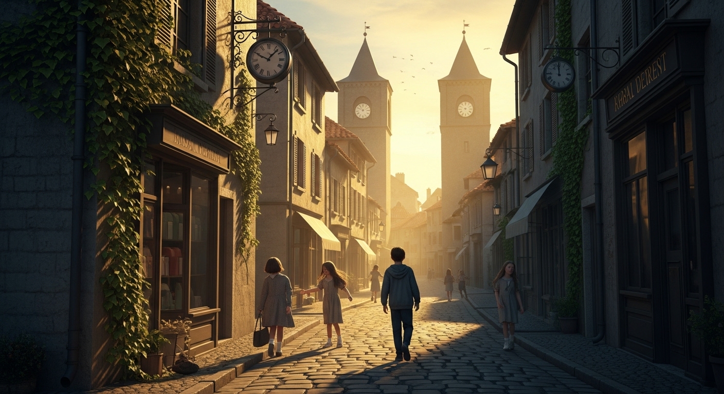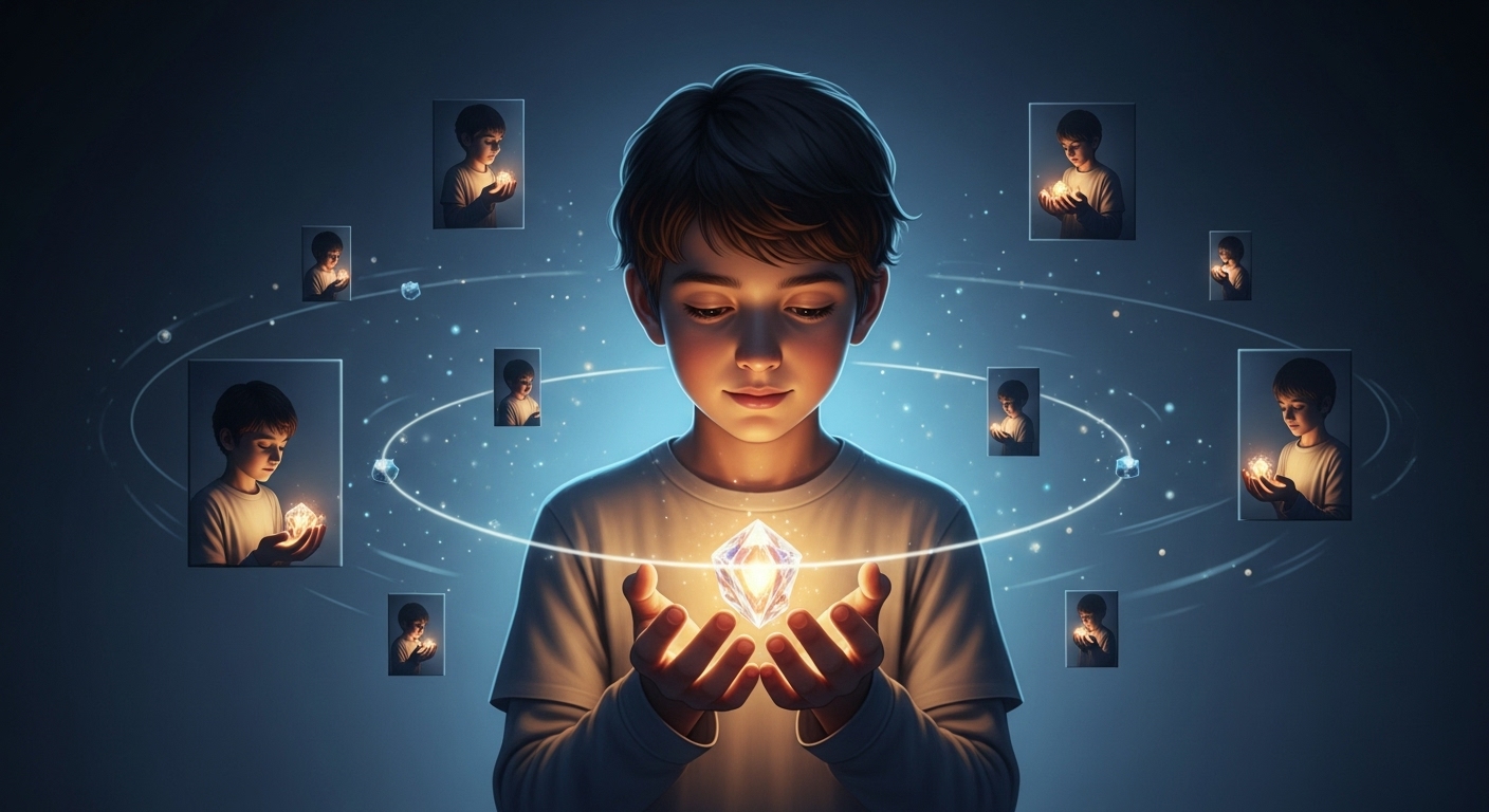 Prompt: Slide 1: The Mirror of Beginnings *A digital painting in a blend of realism and fantasy. A young boy in pajamas stands in a quiet, dimly lit bedroom. He faces a large, antique full-length mirror with intricate wooden carvings. Inside the mirror, the reflection does not match reality — instead, it shows a glowing dreamscape sky filled with golden clouds and stars, and an alternate version of the boy smiling calmly. Books and toys rest quietly on a shelf nearby. The atmosphere is serene and nostalgic, signaling the start of a magical journey. No text. 16:9 aspect ratio.* Slide 2: The Floating Train Above the Clouds *A whimsical scene of a vintage-style train gliding across an ocean of clouds under a radiant sunset sky. The train floats effortlessly with no tracks, its windows glowing softly. A young boy looks out from one of the windows, wind tousling his hair. The sky is vast with pink and orange hues, and distant lightning flashes far away. Ethereal birds fly alongside the train. The mood is both adventurous and contemplative. No text. 16:9 aspect ratio.* Slide 3: The Forest of Talking Trees *A surreal enchanted forest filled with tall, old trees whose faces are subtly formed in their bark. Their leaves shimmer with iridescent colors, and some branches stretch as if gesturing in mid-conversation. The boy walks among them, listening attentively. Soft, dappled light filters through the canopy, and tiny glowing creatures hover nearby. The air is filled with curiosity and gentle whispers. No text. 16:9 aspect ratio.* Slide 4: The Sky-Swimming Fish *Fantastical scene where large, colorful koi fish swim through the sky above a mountain landscape. The boy floats beside them, riding on one fish's back, laughing with joy. The clouds form waves, and the sky has a twilight gradient from deep blue to violet. The fish leave shimmering trails in the air. The feeling is weightless and full of wonder. No text. 16:9 aspect ratio.* Slide 5: The Bookshelf of Floating Memories *A dreamlike scene where floating bookshelves stretch across a starry sky, suspended in midair. Each book opens to reveal glowing holographic memories—scenes from the boy’s past, such as birthdays, lost toys, laughter with family. The boy reaches out gently to one book, eyes filled with wonder. The setting is calm and reflective. No text. 16:9 aspect ratio.* Slide 6: The Town Where Time Stopped *A mysterious old town bathed in golden hour light, where clocks on towers and shop walls have all stopped. Children play endlessly in the streets, frozen in joyful games. The boy walks alone down the cobblestone street, curious and cautious. Ivy grows over the buildings, and time feels suspended. The air carries a nostalgic stillness. No text. 16:9 aspect ratio.* Slide 7: The Sky with Two Moons *A panoramic night sky with two full moons casting silvery light over a fantastical mountain range. Stars swirl slowly in patterns, forming musical-like constellations. The boy sits quietly on a hilltop, gazing upward in awe. A calm, meditative feeling pervades the scene. Cool colors dominate: navy, lavender, and soft white. No text. 16:9 aspect ratio.* Slide 8: The Guardian Dragon of Dreams *A majestic, translucent white dragon coils in the air above a floating island. Its eyes are wise and gentle, and it emits a soft, magical glow. The boy stands bravely before the dragon, who speaks without words. The sky behind them shifts in cosmic hues of blue, violet, and gold. The scene is noble, mysterious, and respectful. No text. 16:9 aspect ratio.* Slide 9: The Inverted Amusement Park *An upside-down amusement park floats in the sky — roller coasters, Ferris wheels, and colorful tents hang from the clouds above. The boy rides a carousel horse that gallops through the air below it. Candy-colored lighting reflects on the clouds, and floating balloons drift by. The mood is surreal and joyful, like a dream within a dream. No text. 16:9 aspect ratio.* Slide 10: Landscapes Never Seen** *An imaginative landscape where nature defies logic: a grassland of red and green checkerboard patterns, mountains shaped like cubes, and flowers that grow into the sky. The boy walks through this world in awe, marveling at the impossible. Birds with crystalline wings fly overhead. Every element is rich with visual symbolism. No text. 16:9 aspect ratio.* Slide 11: The Lighthouse of Wisdom *A towering lighthouse stands atop a floating cliff, its beacon shining not outward but downward into a misty void. Strange symbols glow along its stone walls. The boy climbs a winding path toward it, drawn by a mysterious pull. The air feels reverent and ancient. This is a place of knowledge and initiation. No text. 16:9 aspect ratio.* Slide 12: The Wise Elder* *Inside the lighthouse, a wise, elderly man sits cross-legged among scrolls, star maps, and floating glass orbs. He has a long silver beard, calm eyes, and a gentle smile. The boy sits across from him, listening intently. Between them floats a glowing seed or crystal, representing understanding. The room glows with quiet enlightenment. No text. 16:9 aspect ratio.* Slide 13: The Moment of Understanding *A symbolic image showing the boy gently holding a glowing crystal or seed in both hands. Around him, the environment shifts — fragments of previous dream scenes orbit him like memories. His expression is one of peace and awareness. It is a visual metaphor for realization and inner growth. No text. 16:9 aspect ratio.* Slide 14: The Return Path *A shining path made of light extends through the dreamscape, leading back toward the mirror seen in the first slide. The boy walks calmly down this path, the dream world slowly fading into stardust behind him. The tone is serene, bittersweet, and meaningful. No text. 16:9 aspect ratio.* Slide 15: The Boy in the Present *Back in the real bedroom, now lit by morning sun. The same boy — now older — sits peacefully at a desk drawing the fantastical scenes from his journey. The mirror r