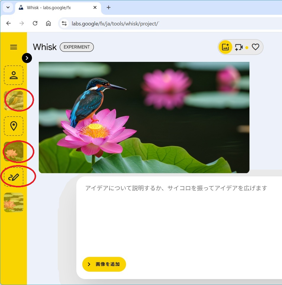 Whiskの左カラムに被写体(Subject)・背景(Scene)・スタイル(Style)を指定。スタイルには"カワセミを蓮の花に乗せる"、出来上がった画像をanimationにして"カワセミが蓮の花から飛び込む"とプロンプト。