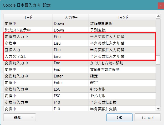 入力キーの「Eisu」の「コマンド」をクリックし「半角英数に入力切り替え」を選ぶ