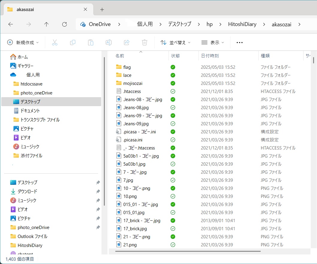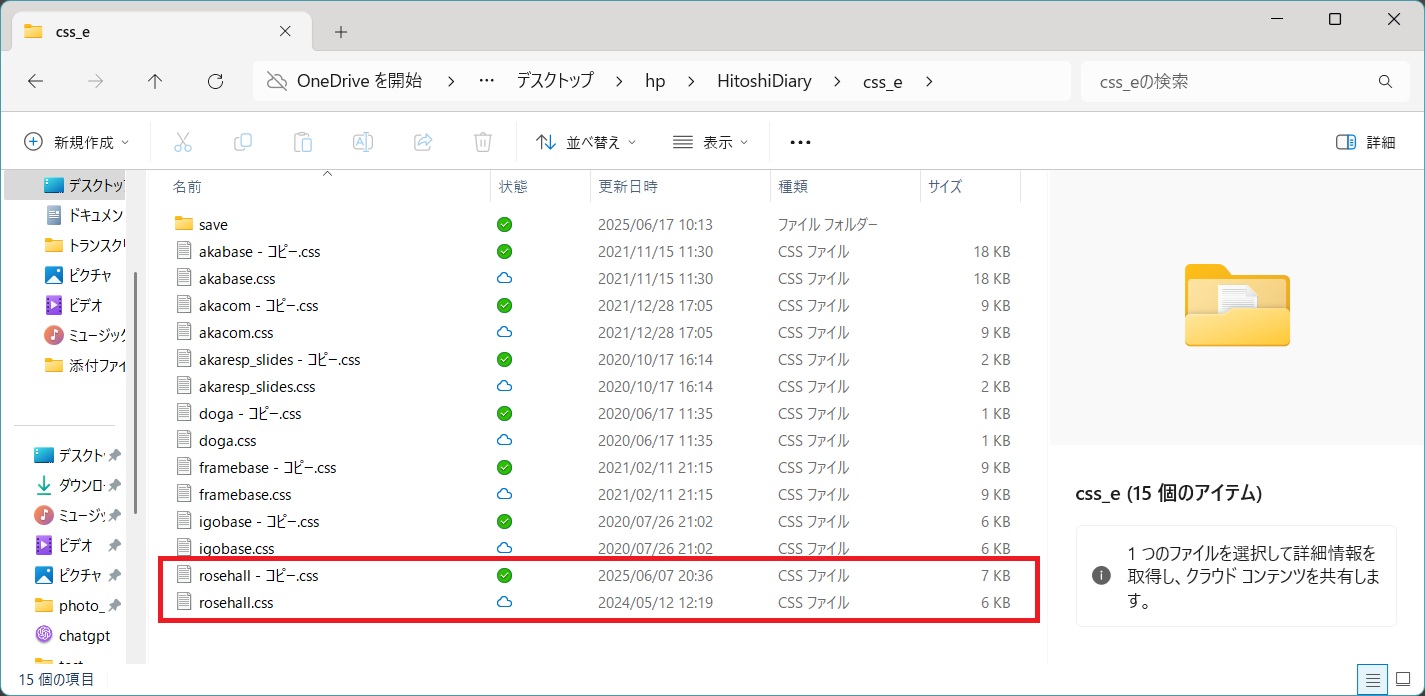 " - コピー"ファイルを削除しようとして気がついたのだが、フォルダーに 例えば rosehall.css と、rosehall - コピー.css というファイルがあって、" - コピー"ファイルを無条件に削除するとある期間の更新が抜け落ちるという例。確かに rosehall.css を最近更新した。同様のケースが結構あった。 これについては、後述の - コピーファイルとオリジナルファイルの更新日がことなる場合の対処手順を参照。