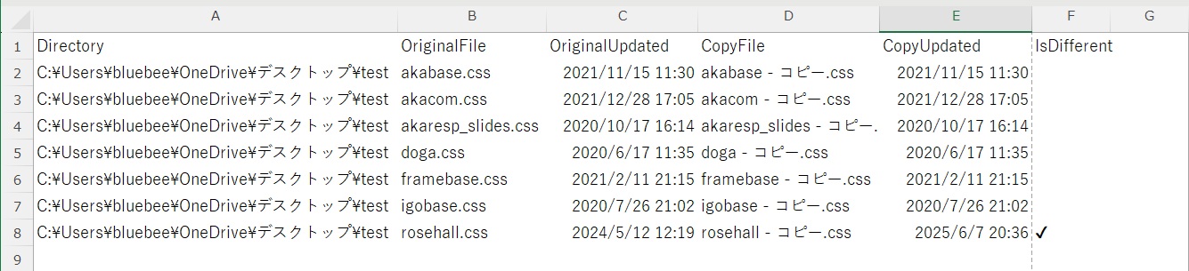 * TotalMinutes を使って更新日の差を「分単位」で計算、1分以上の差がある場合に「✔」を表示、 微妙なミリ秒や数秒の違いでは「✔」が付かないため、実質的な違いがあるファイルだけがマークされる。