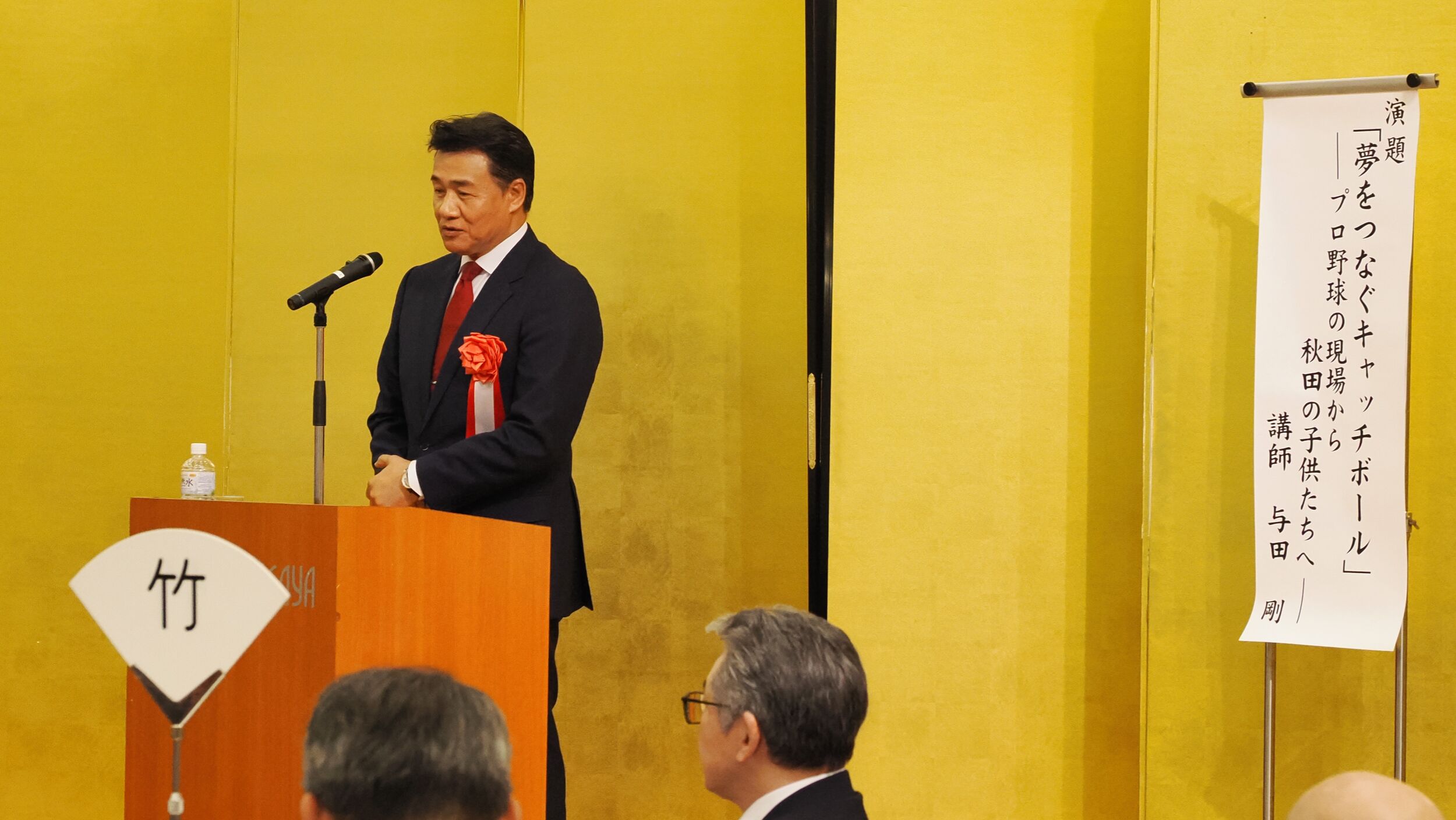 与田氏は1965年北九州市生まれ、第一印象はとても背が高く肩幅の広い男前。1990年に中日ドラゴンズにドラフト1位入団した時からの監督や選手たちとの裏話など、更に現役引退後には指導者の立場での心境など、ジョークを交えて熱く語った。2019年から2021まで中日の監督を務めた。現在はNHK野球解説者。 20年以上秋田県内で野球教室を通じて子供たちの指導をしている。