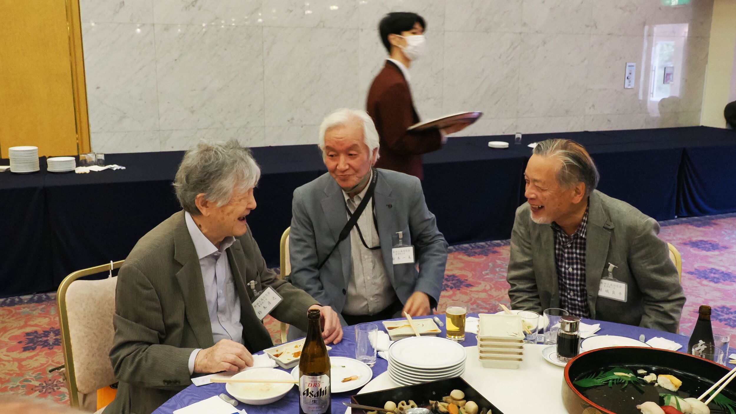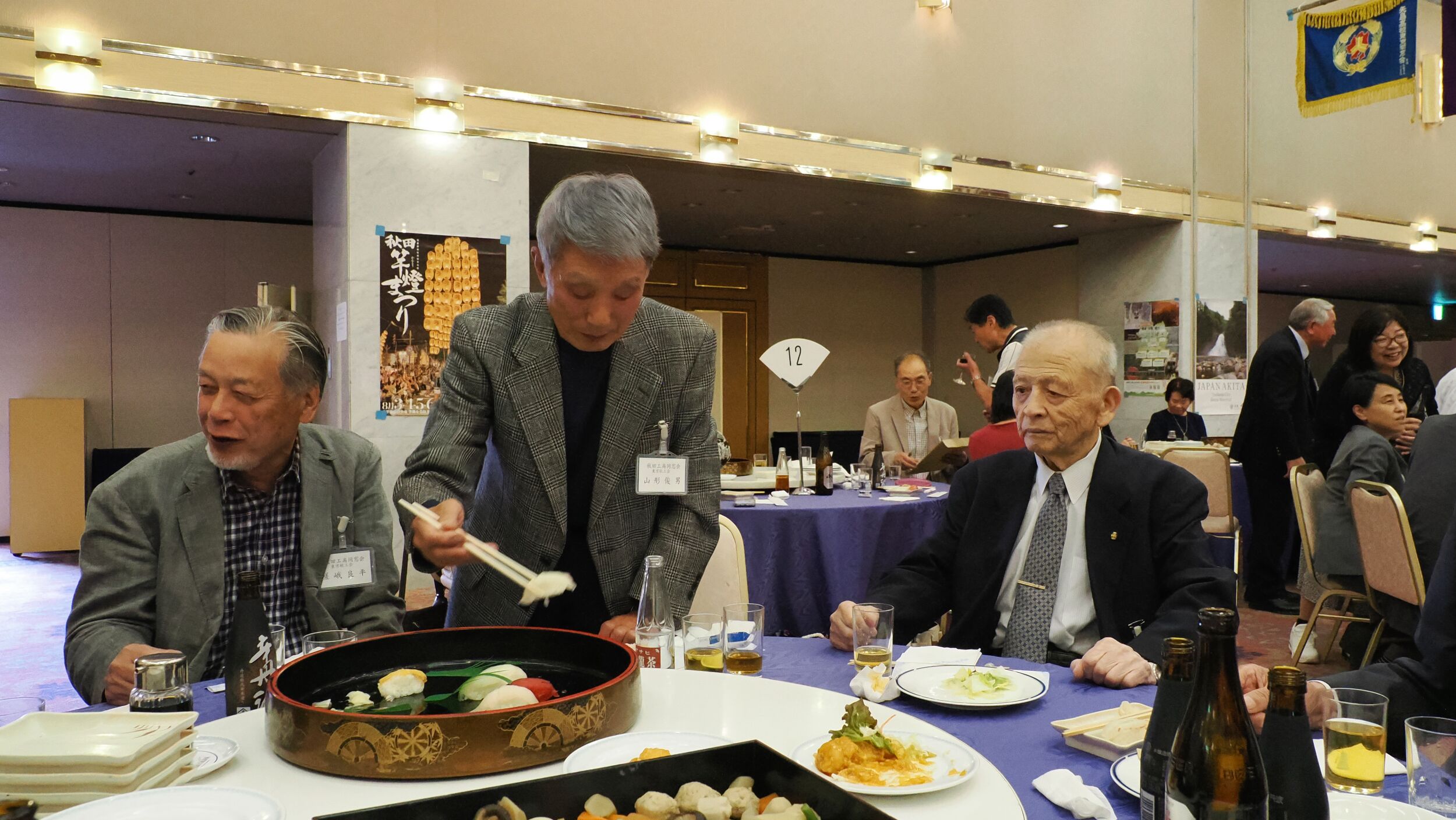 交歓会 : 秋高連関係者で亡くなられた方々へ黙祷を捧げた。全員で秋田県民歌斉唱、来賓挨拶、橋本五郎氏の音頭で乾杯。