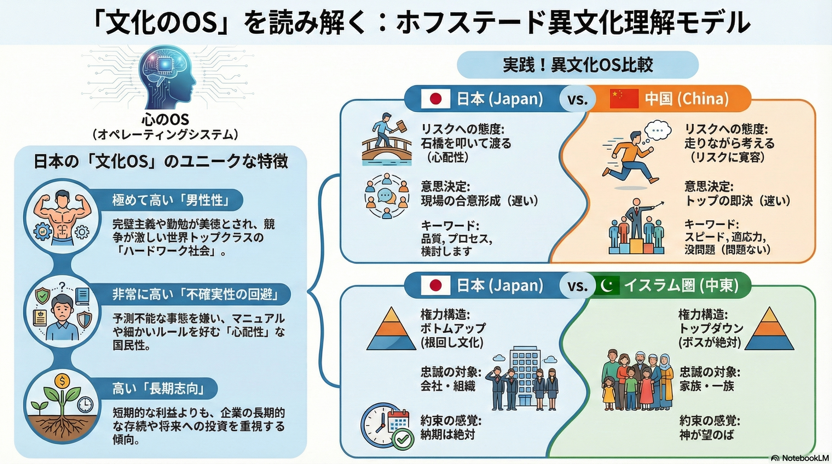 特に「不確実性の回避(リスクへの態度)」のスコア差が決定定的で、これが日中ビジネスの現場で起きる「スピード感の違い」や「品質に対する考え方のズレ」の主因となっています。