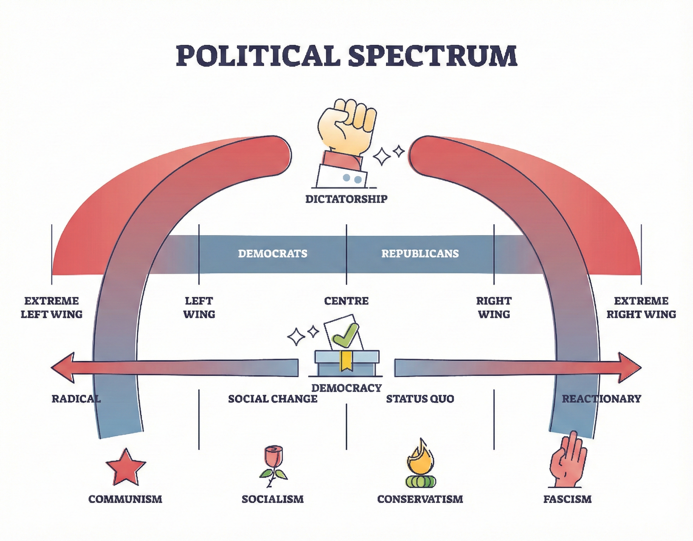 なぜ、目指す理想が正反対のはずの「極左」と「極右」が、最終的に同じ「独裁制」に行き着いてしまうのか。そのメカニズムを解説します。 1. 「中央(民主主義)」が前提としているもの まず、図の中央にある「民主主義(Democracy)」が何をしているかを確認します。 民主主義は、社会の中に多様な意見、利益、価値観が存在することを認め(多元主義)、それらの対立を暴力ではなく、選挙、議会での議論、法の手続きを通じて調整しようとするシステムです。時間がかかり、妥協が必要で、完璧な理想は実現しにくいですが、権力の暴走を防ぐ仕組みがあります。 2. 極左(Extreme Left)が独裁に至る道 図の左端、「共産主義」に代表される極左の目標は、究極の平等な社会、階級のない社会を実現することです。 理想: 貧富の差をなくし、すべての人が平等に扱われる理想郷。 現実の壁: しかし、現実社会には資産家がいたり、変化に反対する人々がいたりします。民主的な手続き(話し合いや選挙)を踏んでいては、彼らの抵抗にあって革命的な平等はいつまでも実現できません。 独裁への転換: そこで、理想を急速に実現するために、「抵抗勢力(資本家など)を力ずくで排除する必要がある」という論理が生まれます。「プロレタリア独裁(労働者による独裁)」という名目のもと、特定の党や指導者に強力な権力を集中させ、反対派を弾圧し、社会のすべてを国家が管理する体制へと移行します(例:スターリン時代のソ連など)。 結果として、平等を求めたはずが、特権的な指導部による独裁体制になります。 3. 極右(Extreme Right)が独裁に至る道 図の右端、「ファシズム」に代表される極右の目標は、国家や民族の純粋性、過去の栄光を取り戻すこと、そして強力な秩序です。 理想: 強く団結した国家、優秀な自民族による支配、規律ある社会。 現実の壁: 社会には多様な民族や、リベラルな思想を持つ人々、労働運動などが存在し、彼らが「国家の統一を乱している」と見なします。民主主義的な議論は「弱腰」で「非効率」だと考えます。 独裁への転換: 国家の危機を救い、強力な秩序を回復するためには、議論よりも「強力な指導者(総統など)による断固たる行動」が必要だとされます。反対者を「非国民」「劣等な存在」として暴力的に排除し、すべての国民を国家目標に従わせる体制へと移行します(例:ナチス・ドイツ、戦前のイタリアなど)。 結果として、秩序を求めたはずが、暴力的な指導者による独裁体制になります。 4. なぜ両者は似てくるのか(共通点) 極左と極右は、「理想とする社会像(目的)」は正反対です。しかし、その理想を民主主義的なプロセスを無視して強引に実現しようとした結果、「統治の手法(手段)」が驚くほど似通ってしまいます。 図の上段で、両端が同じ「握りこぶし(力による支配)」のイラストになっているのは、以下の共通点を示しています。 民主主義と多元主義の否定: 「自分たちの思想だけが絶対的に正しい」と考え、異なる意見や野党の存在を認めません。 暴力と恐怖による支配: 目的達成のためなら、反対派への暴力や粛清を正当化します。秘密警察や強制収容所などが用いられます。 全体主義(Totalitarianism): 政治だけでなく、経済、文化、教育、国民の私生活に至るまで、国家がすべてをコントロールしようとします。 指導者崇拝・一党独裁: カリスマ的な独裁者や、唯一の支配政党に絶対的な権力を集中させます。 結論として この図は、「どのような素晴らしい理想(極端な平等や、極端な秩序)を掲げていたとしても、それを実現するために民主的な手続きや対話を放棄し、反対者を力でねじ伏せようとすれば、行き着く先は自由のない『独裁制』である」という、歴史的な教訓を視覚化していると言えます。