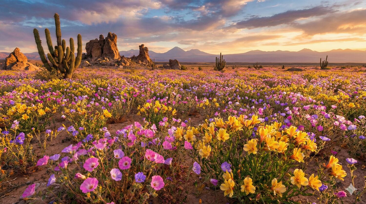 世界で最も乾燥した砂漠で、数年に一度のまとまった雨の後にだけ起こる、砂の大地がピンクや紫の花々で覆われる神秘的な「砂漠の花」現象です。