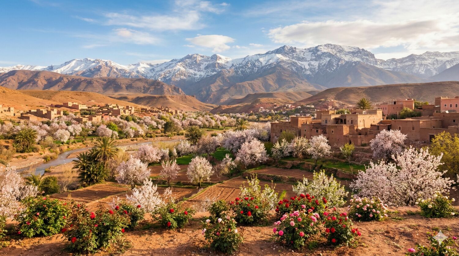 アフリカ北部の高山アトラス山脈の雪山を背景に、麓の谷間(オアシス)ではアーモンドやバラの花が咲き、荒涼とした大地に春の彩りを添えます。