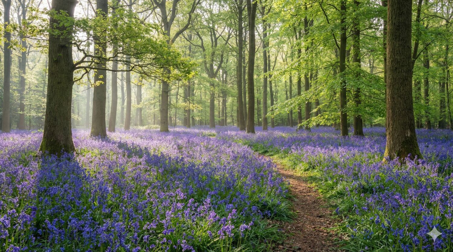 ブナの新緑が芽吹く森の地表を、野生のヒヤシンス(ブルーベル)が一面に覆い尽くし、森の床が青紫色に霞む幻想的な「青い森」が出現します。