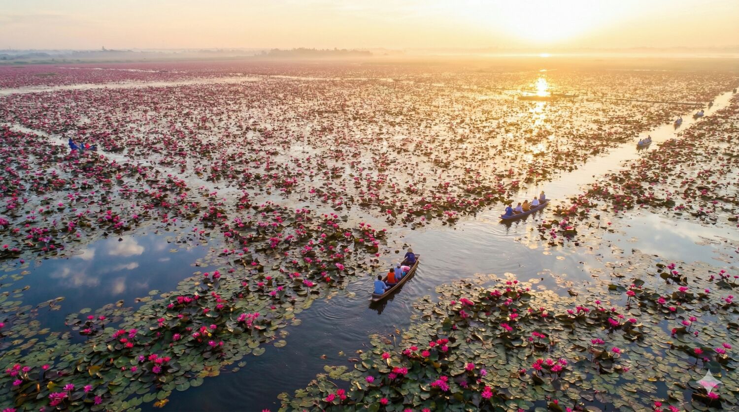 「紅い睡蓮の海」の名の通り、乾季の終わりの早朝、広大な湖面が視界の限りピンク色の睡蓮の花で埋め尽くされる神秘的な光景です。