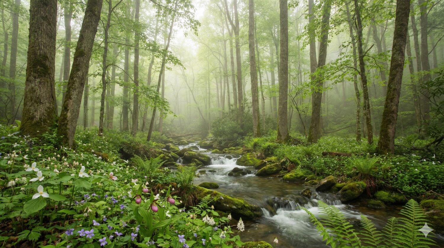 「スモーキー」の名通りの霧に包まれた豊かな原生林の中で、新緑の芽吹きとともに多種多様な野生の草花が林床でひっそりと花を開きます。