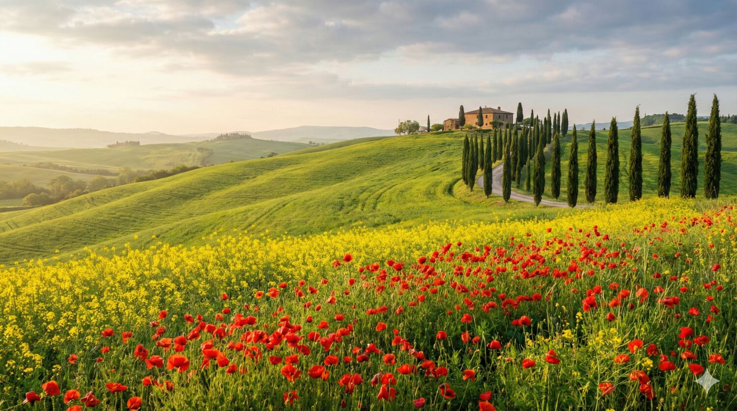 なだらかな丘陵地帯と糸杉の並木道というトスカーナの典型的景観に、春は赤いポピーや黄色い菜の花が彩りを添え、牧歌的な美しさが増します。