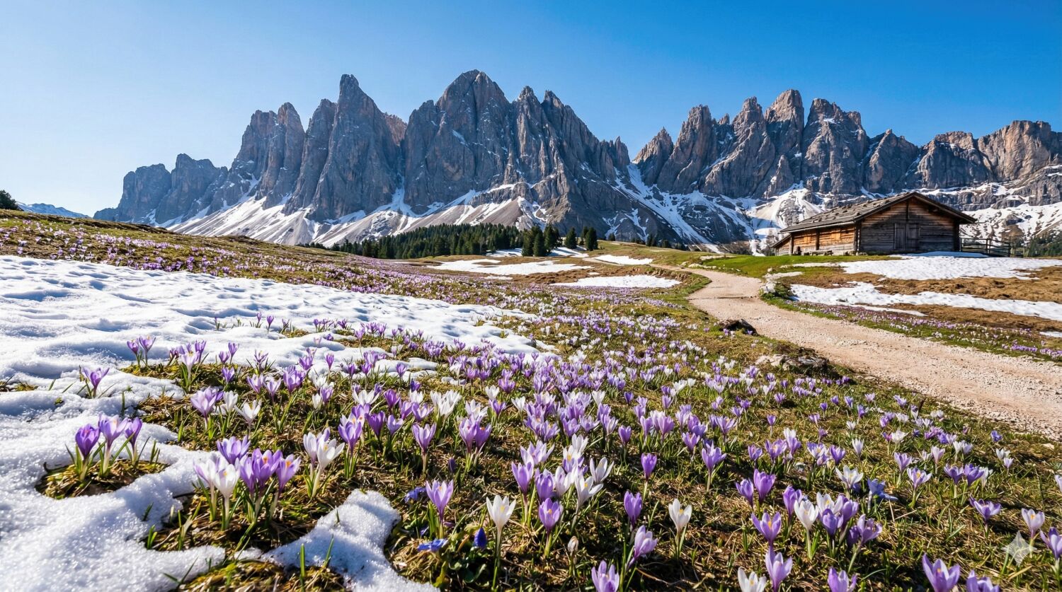 世界遺産の荒々しい岩山の麓、雪解け水が流れる高山植物の草原(アルプ)に、クロッカスなどの小さな花々が春の訪れを告げます。