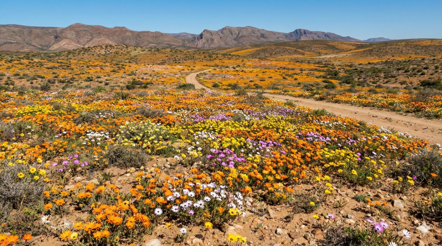 年間を通じてほとんど雨の降らない乾燥した荒野が、春の短い雨季の後にだけ、奇跡のように一面のワイルドフラワーの花畑へと変貌します。