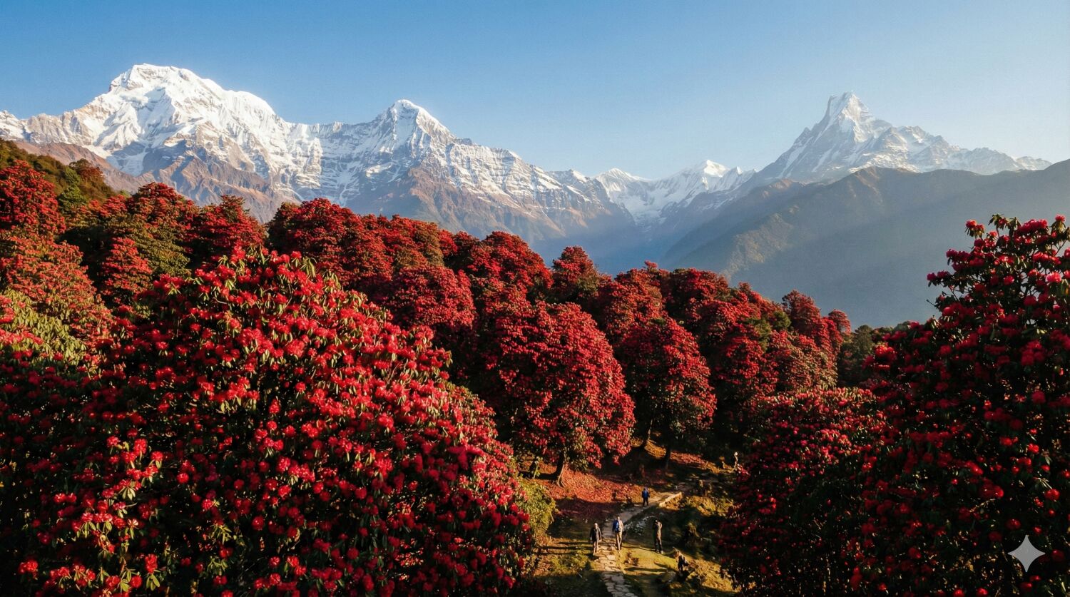 世界の屋根ヒマラヤの白い巨峰を背景に、ネパールの国花でもある真っ赤なシャクナゲの原生林が山肌を情熱的に染め上げます。