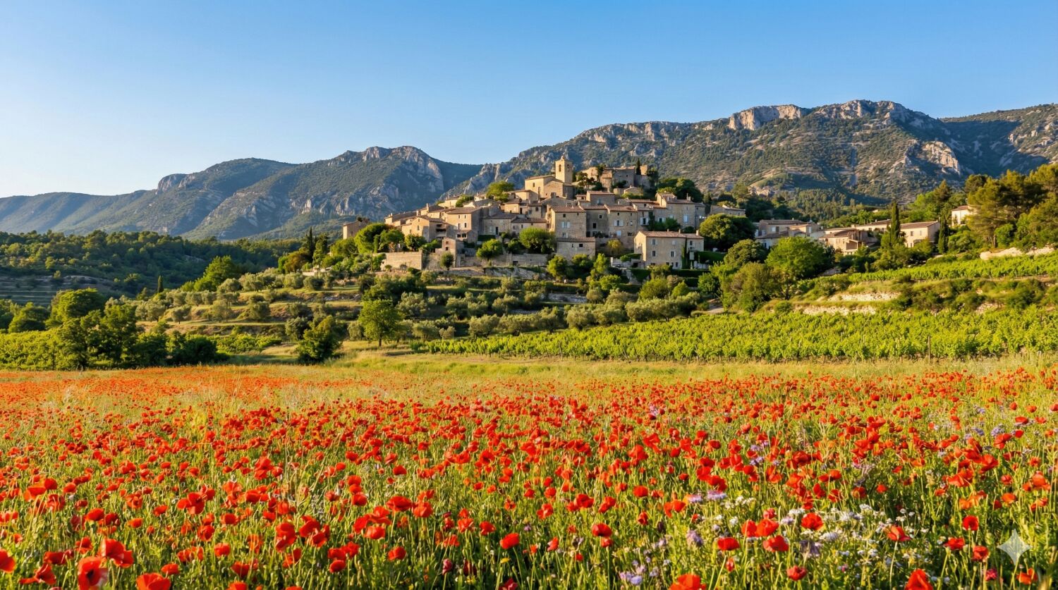 蜂蜜色の石造りの村々とオリーブ畑が続く南仏の風景の中に、春には真っ赤なポピー(ヒナゲシ)が風に揺れ、穏やかな季節の到来を感じさせます。