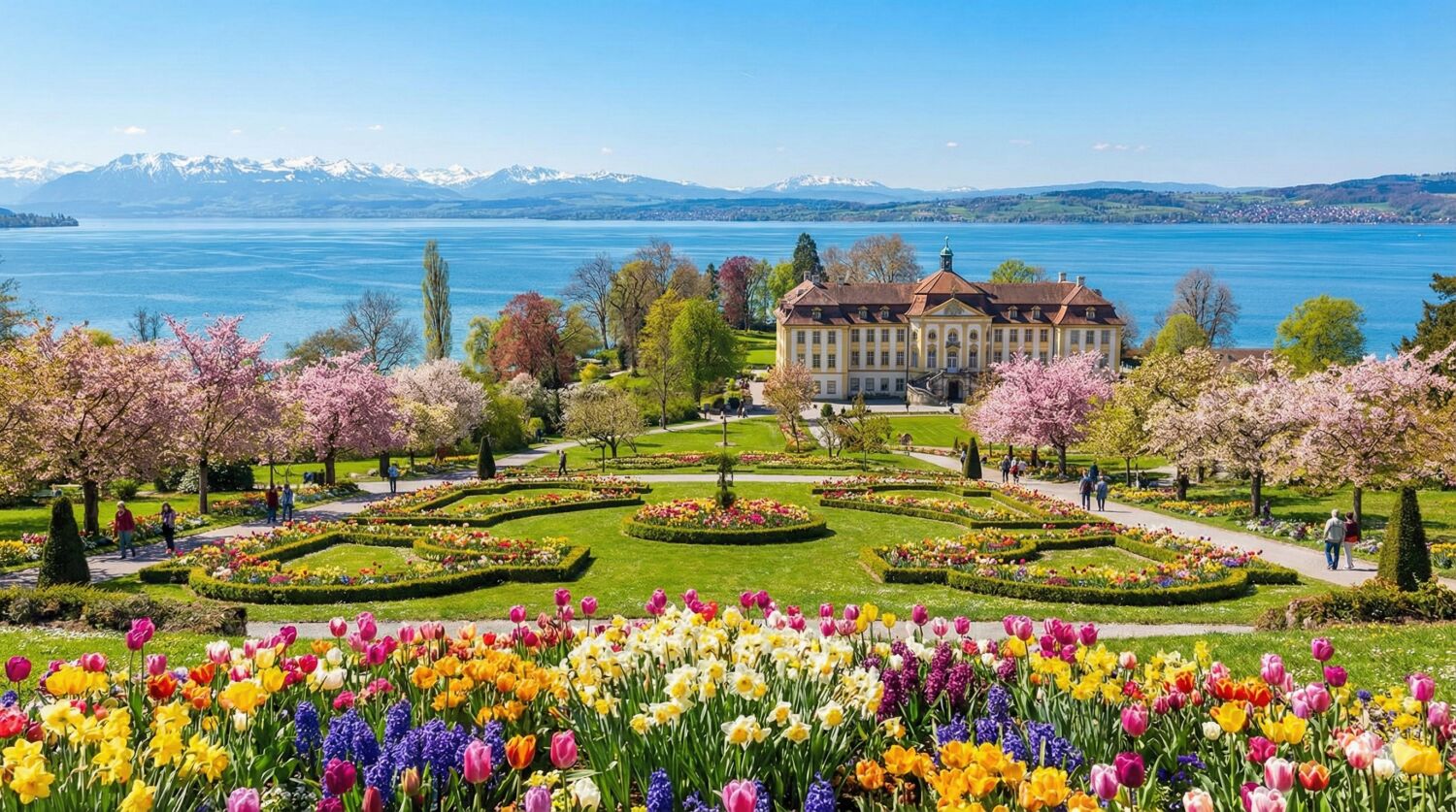 遠くにアルプスを望む湖に浮かぶ「花の島」。島の庭園全体でチューリップや果樹の花など、多彩な春の花々が咲き誇る優雅な景色です。