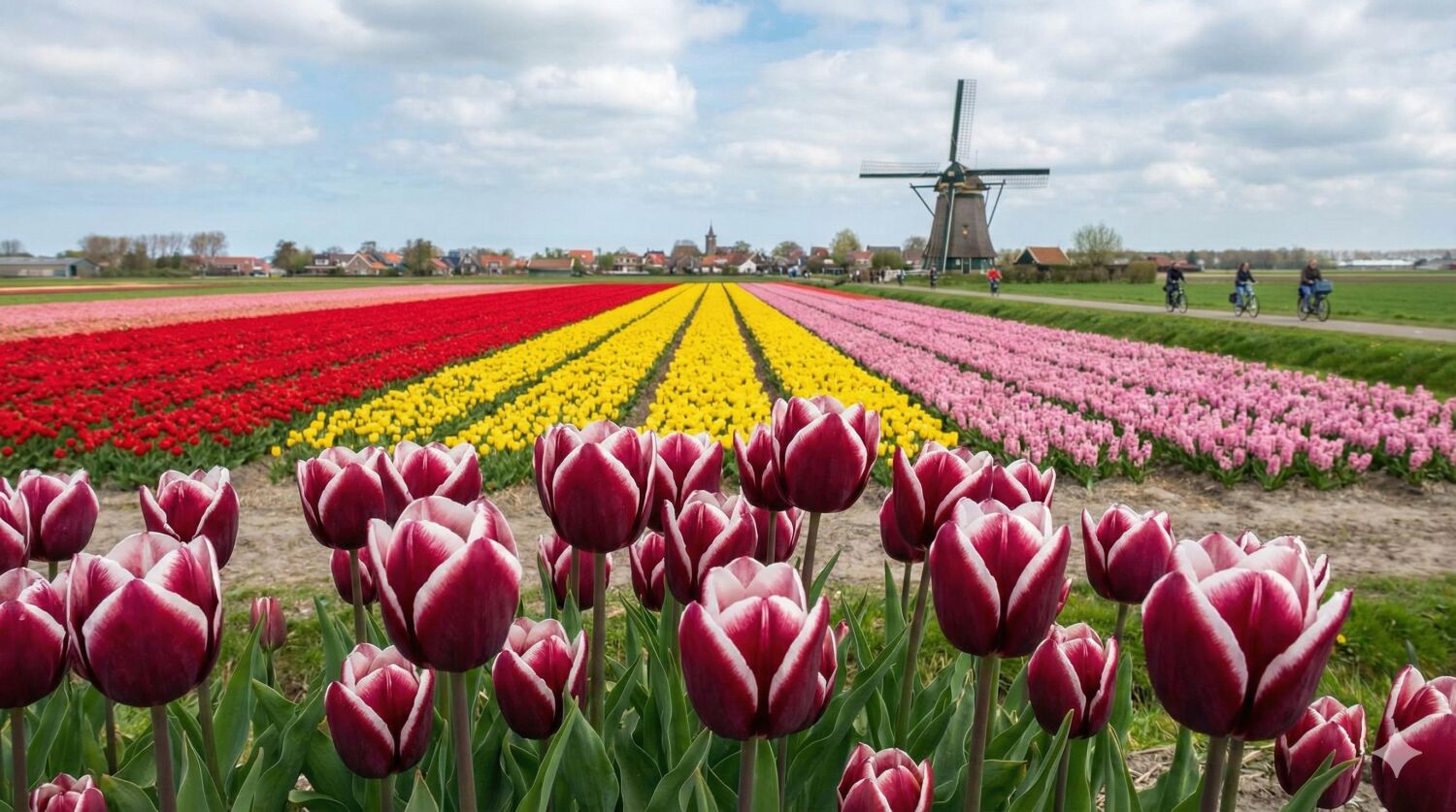 まるで大地のパッチワークのように、赤、黄、ピンクのチューリップやヒヤシンス畑が鮮やかなストライプ模様を描き、遠くに風車が佇むオランダらしい風景です。手前はアルマーニという種類の花
