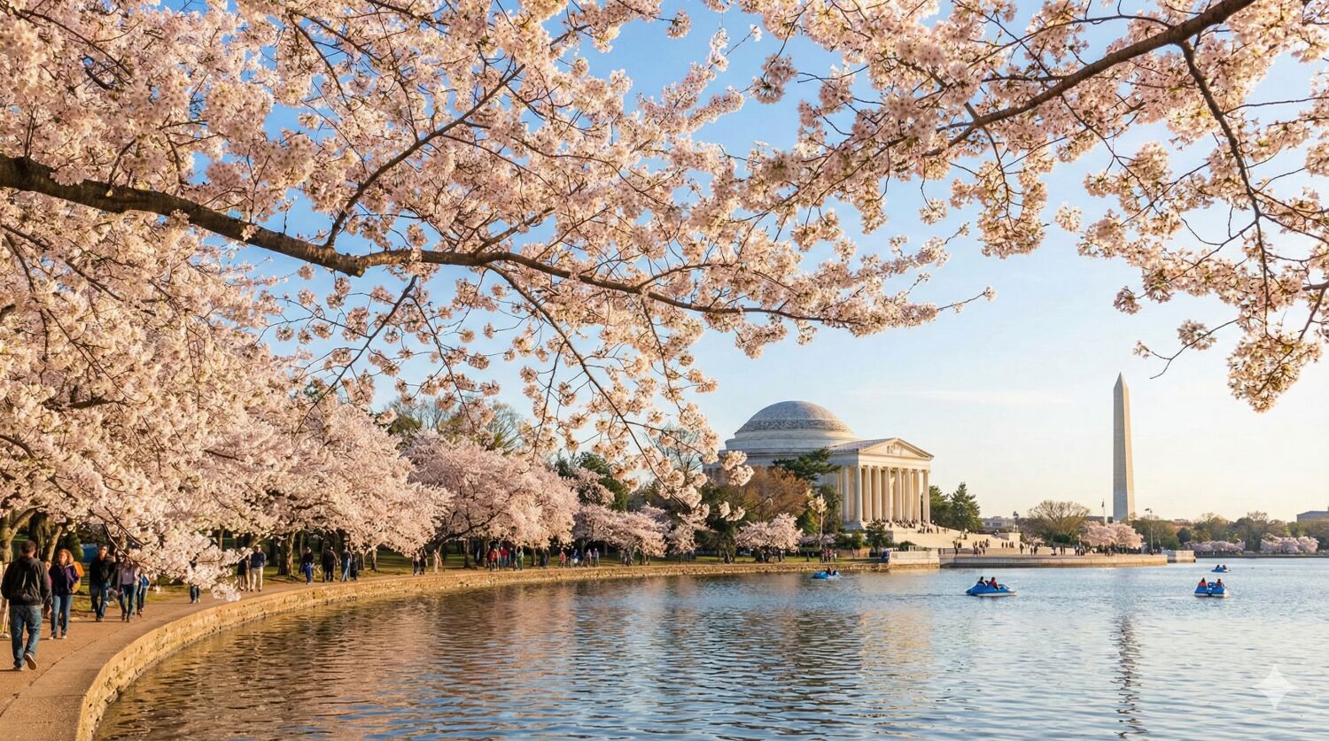 タイダルベイスン湖畔の水辺を囲むように日本から寄贈された桜が咲き誇り、記念碑群の白い大理石と淡いピンク色が競演するアメリカの春の象徴です。