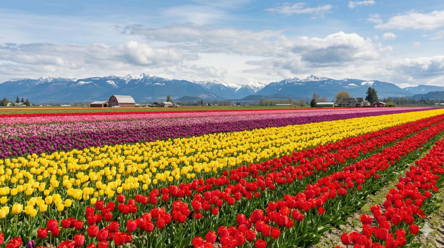 雪を抱いたカスケード山脈を背景に、広大な農地に植えられたカラフルなチューリップの畝が地平線まで続く、北米随一の花の絶景です。