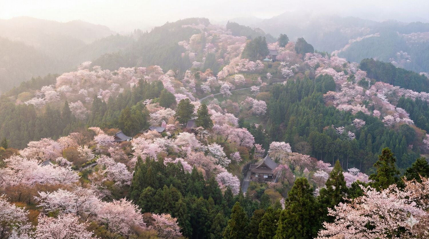シロヤマザクラを中心に約3万本の桜が山全体を覆い尽くし、麓から山頂へ向かって順に咲き上がっていく様は「一目千本」と称される壮観さです。