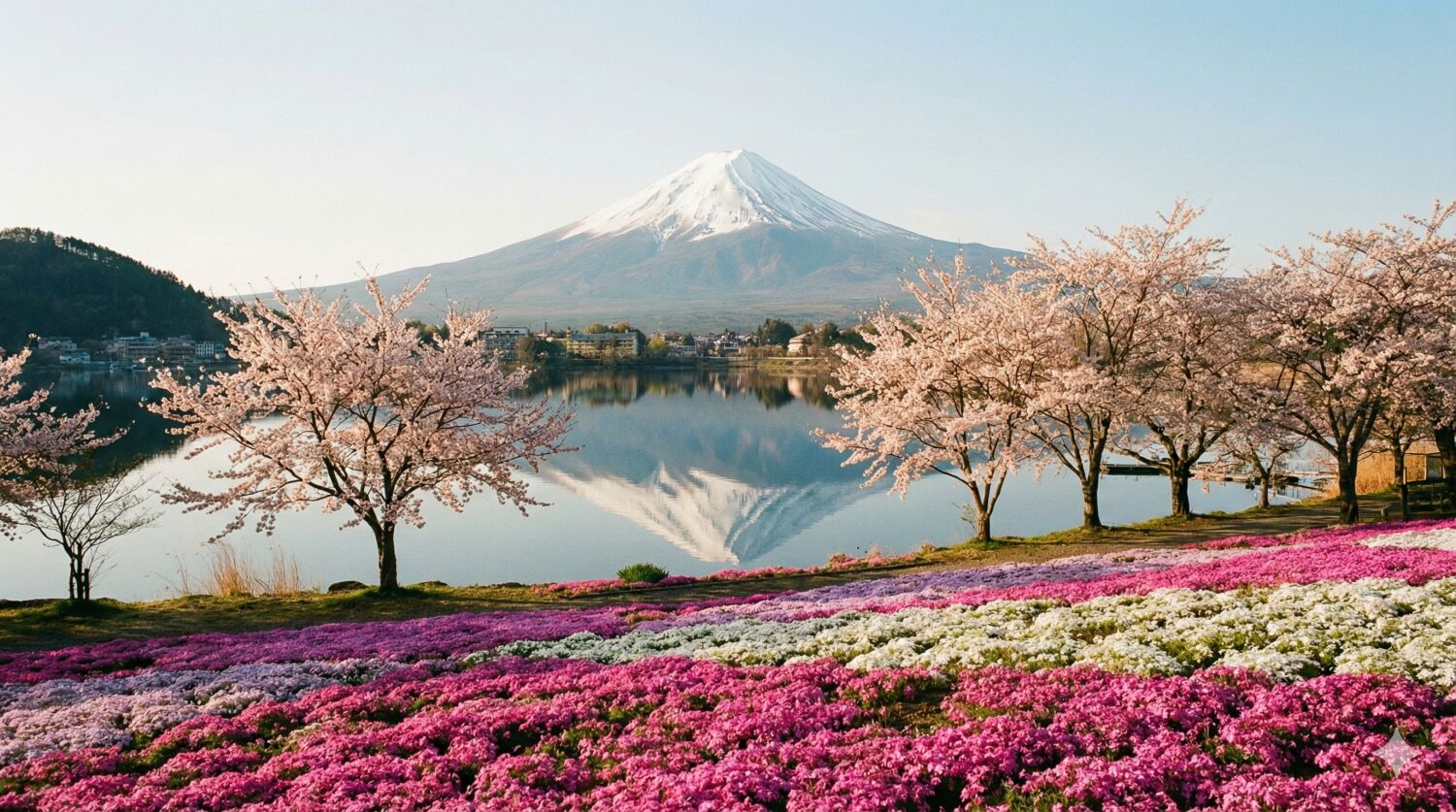 | 1 | 日本 | 富士五湖(山梨県) | 桜、芝桜 | 残雪の富士山と湖面への映り込み |