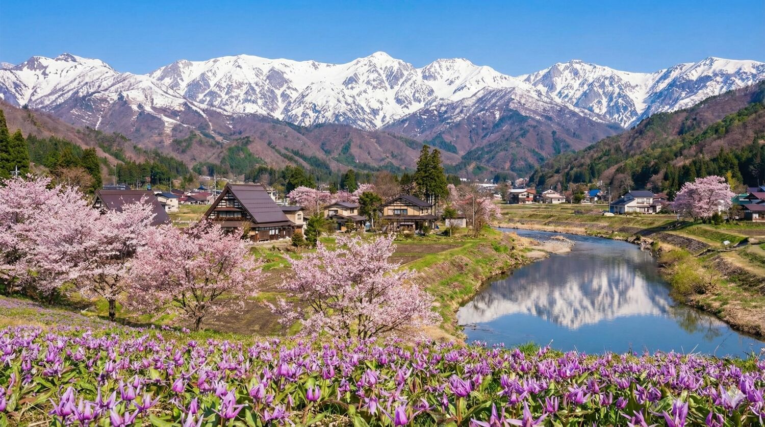 残雪が輝く北アルプスの険しい山並みを背景に、麓の里山では桜やカタクリの花が咲き競う、日本の美しい原風景に出会えます。