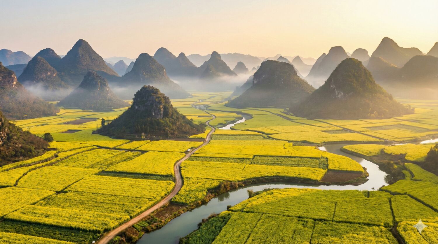 カルスト地形特有のポコポコとした山々の間に、見渡す限り黄金色の菜の花畑の海が広がる、大陸ならではのスケールの大きな春景色です。
