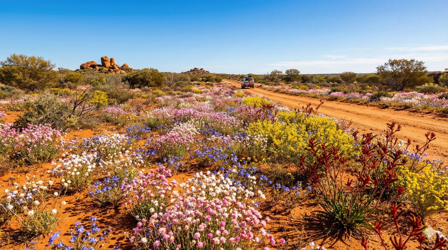 広大で乾燥した赤土の大地(アウトバック)が、春の訪れとともに多種多様なワイルドフラワーで埋め尽くされ、天然の花畑へと変貌します。