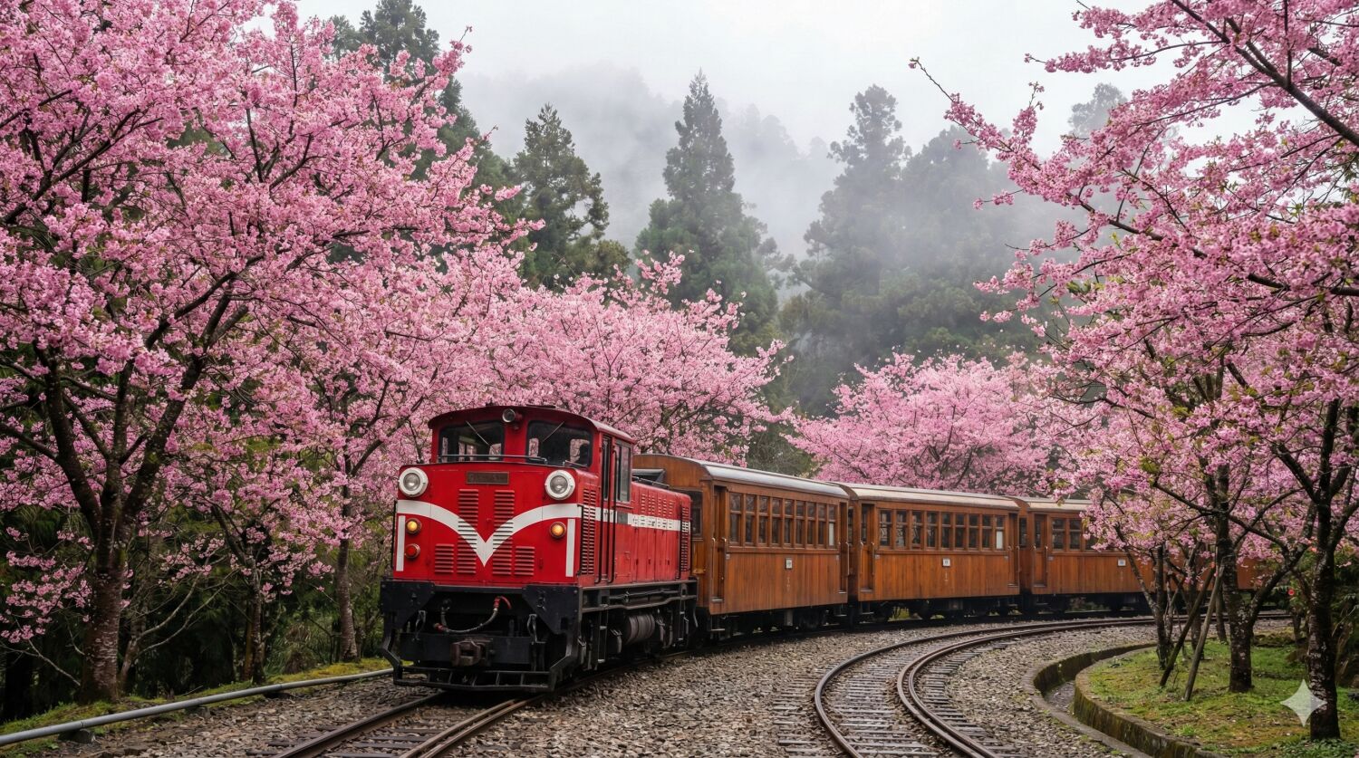 霧に包まれた幻想的な原生林の中を走るレトロな高山鉄道と、沿線に咲き誇る濃いピンク色の桜が織りなす、台湾を代表する春の景観です。