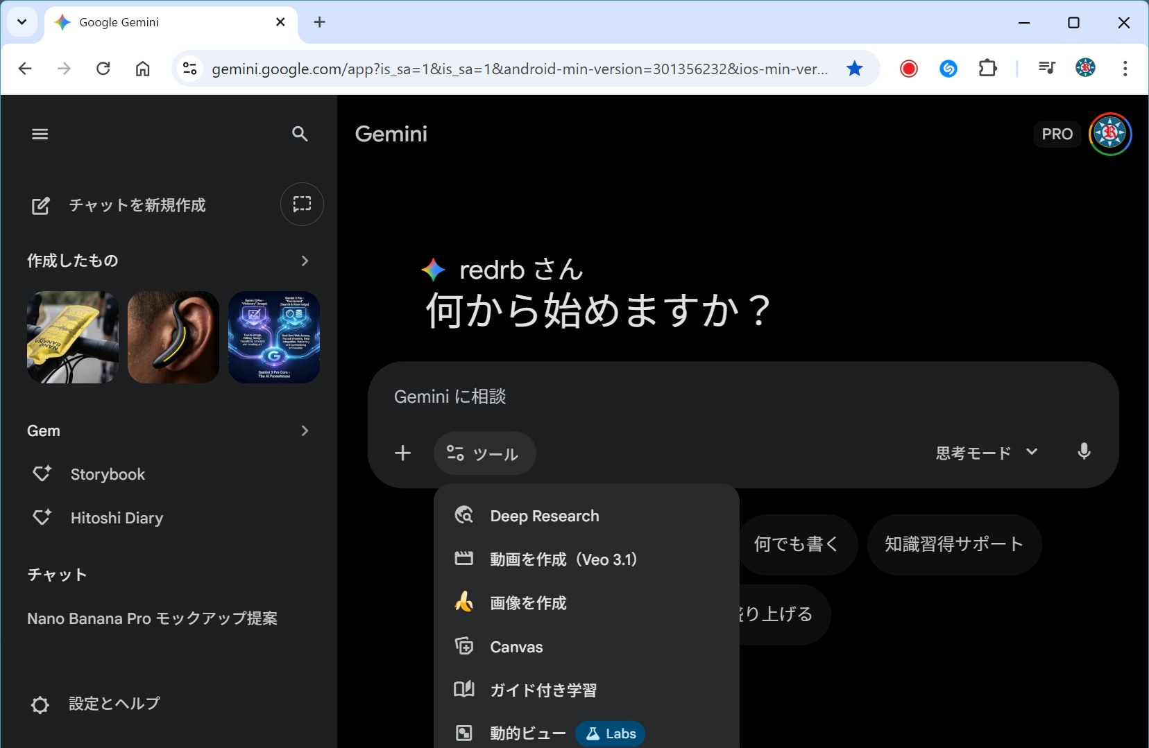 Gemini 3 Pro のスタート画面 ➯ ツールメニュー