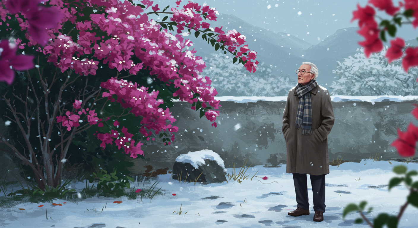 A gentle winter morning landscape in the prologue depicting the author preparing for a journey. The figure, a man in his 70s, stands outside wearing a long coat and scarf, gazing thoughtfully into the distance. Despite the surrounding snow-covered landscape, vibrant bougainvillea flowers bloom brightly in the background. The soft morning light illuminates the scene, creating a striking contrast between the bright flowers and the muted winter colors. The atmosphere is calm and contemplative, symbolizing the beginning of a meaningful journey.